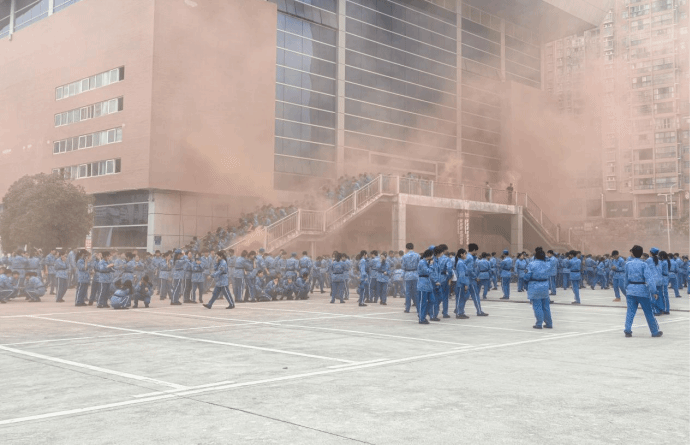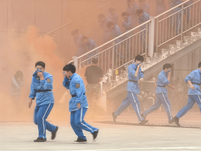 活动首先进行火情疏散逃生演练。演练前,消防人员详细讲解了疏散注意事项和操作要求。随着烟雾弥漫、警报响起,演练正式开始。军训教官迅速就位,引导学生用湿毛巾捂住口鼻、弯腰低姿,沿预定路线快速有序撤离。整个过程紧张高效,全体新生均安全、迅速到达指定集合地点。