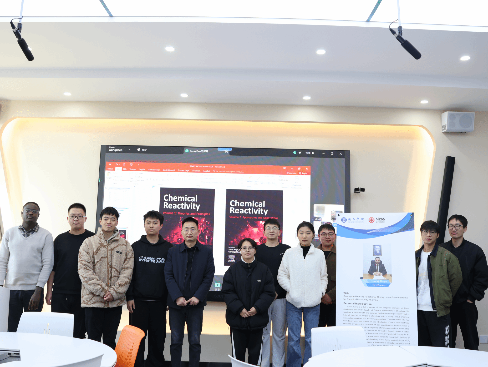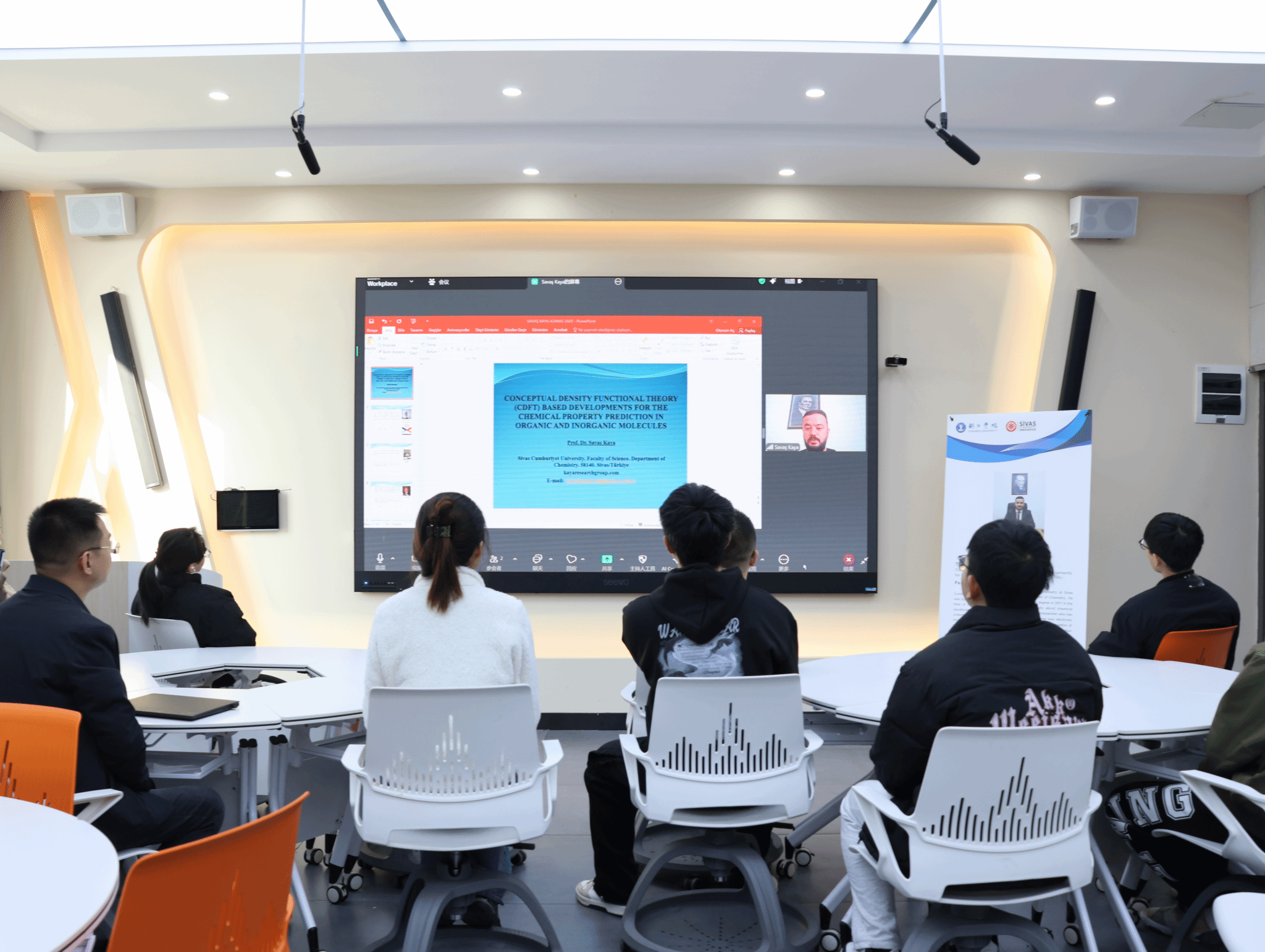 活动伊始,Savas Kaya 教授通过视频连线向与会师生致以亲切问候,并以“Conceptual density functional theory (CDFT) based developments for the chemical property prediction in organic and inorganic molecules”为题,系统阐述了概念密度泛函理论(CDFT)的基本框架与前沿进展。他深入讲解了 CDFT 中化学势、电负性、化学硬度等反应性描述符的定义及其物理内涵,重点介绍了如何从电子结构层面统一理解和预测分子的稳定性与反应性,为同学们构建起较为完整的理论认知体系。在讲座的互动环节,我院研究生展现出扎实的学术功底和活跃的创新思维。同学们围绕“CDFT各原理间的内在逻辑”以及“理论在不同化学体系中的适用边界”等前沿问题,与Savas Kaya教授展开了热烈而深入的探讨,现场学术氛围浓厚。