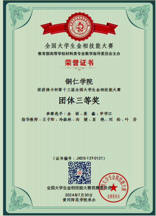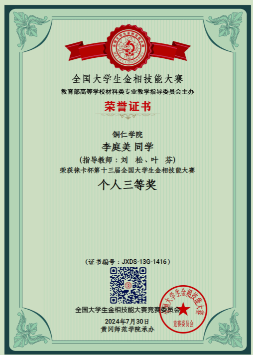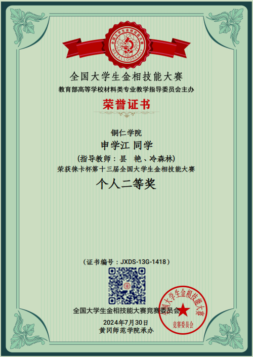7月25-30日,由教育部高等学校材料类专业教学指导委员会主办、湖北黄冈师范学院承办的第十三届全国大学生金相技能大赛决赛在湖北黄冈举行。本次大赛分预赛和决赛两个阶段,预赛报名参赛高校达571所,参赛选手达400488名。经过26个分赛区预赛选拔最后531所高校1460名选手参加决赛。大赛规模空前,参赛高校选手、指导教师竞赛委官员、裁判、特邀嘉宾共计3520人齐聚湖北黄冈共襄盛会。伟德官网王子阳、向媛、昙艳3指导教师代表bv伟德国际1946带领我院材料科学与工程专业的2021级、2022级金丽、聂鑫申学江同学参加本次国赛决赛参赛选手秉持“执着专注、精益求精、一丝不苟、追求卓越”的工匠精神沉着应战,激烈比拼伟德官网参赛选手在赛场上充分发挥自己的能力取得了优异成绩,其中,金丽同学获个人“一等奖”,聂鑫和申学江同学分别获个人“二等奖”,bv伟德国际1946代表队获团体“三等奖”的好成绩。
