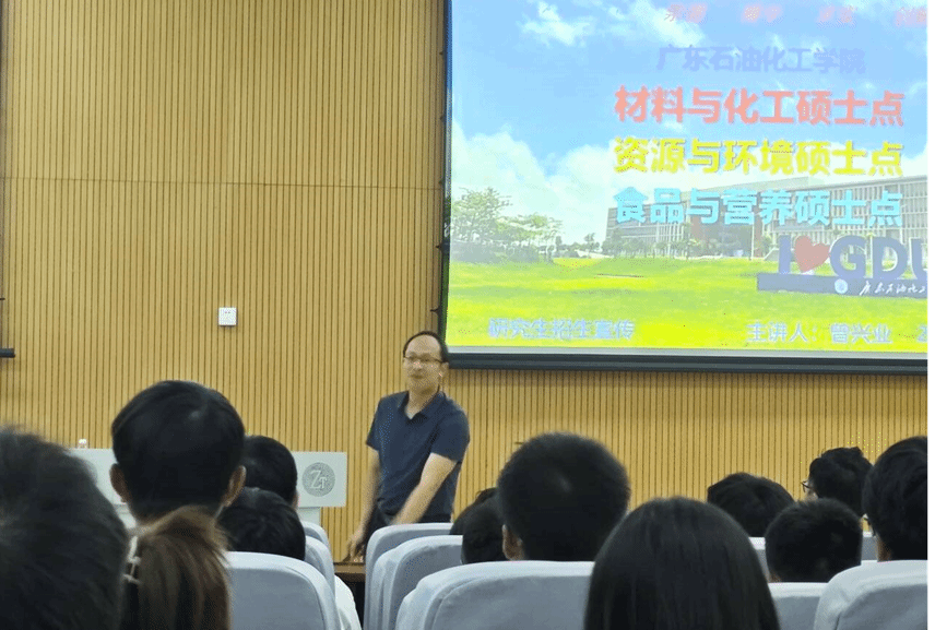 宣讲会上,曾兴业介绍了广东石油化工学院材料与化工领域的专业优势,从学科建设、课程设置、科研平台、就业去向等方面展开介绍,直观展现了该校相关专业的办学实力与发展前景。宣讲环节结束后,现场进入互动答疑阶段。针对同学们会上提出的双导师制的具体匹配流程、报考专业的复试科目与考核重点、研究生阶段可参与的科研项目类型等问题,曾兴业院长结合自身工作经验,逐一耐心解答。现场学子纷纷表示,此次宣讲会信息实用、针对性强,为自己的考研规划提供了重要参考。