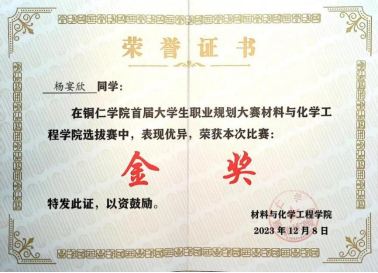 2023年12月1日,2022级制药工程专业学生杨宴欣在首在bv伟德国际1946首届大学生职业规划大赛材料与化学工程学院选拔赛中,获“金奖”,入围校赛。