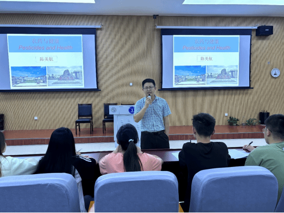 陈美航教授是贵州省“千”层次创新型人才、贵州省科技专家库专家、中国化工学会会员、bv伟德国际1946学术委员会委员、bv伟德国际1946学术带头人。主要从事新药创制、精细化工和有害生物防控等方面的研究。先后主持项目14项,其中国家自然科学基金1项、贵州省科技厅项目3项、国家中医药管理局项目1项等;发表40多篇学术论文,其中SCI收录论文30多篇;获中国发明专利授权2项,参编3部学术论著。本次学术讲座上,陈教授从使用农药的目的和意义出发,介绍了农药的定义、发展、危害性、残留农药的消除方法,以及农药对人类生存环境和身体健康的影响、现代农药与人类文明等七个方面逐一展开。陈教授的讲座内容丰富、知识面广、信息量大,其以生动的语言和典型的案例讲述了农药与健康的关系,启发了同学们对待农药的使用与环境问题、人类健康等方面的辩证思维。并与在场师生就现代农药的研究方向与前沿、农药进入人体的途径以及日常生活中如何减少农药残留的方法等相关问题展开热烈互动,大家深受启发、收获颇丰,通过本次讲座学习,对于农药与健康方面有了较深入地了解,对未来的学习研究有很大帮助。
