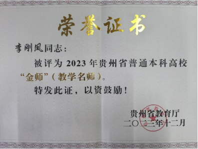 2023年12月,李刚凤老师被评为贵州省普通本科高校“金师”(教学名师)。
