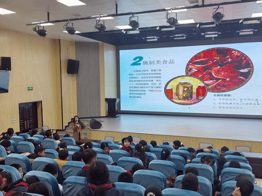 下午2:20,第二轮讲座开始。四年级学生在报告厅迎来了研究生党支部王娅楠同志的《关注食品安全》讲座。王娅楠同志通过直观的图片和案例,详细讲解了“十大垃圾食品”的危害,剖析了“三无”食品的风险,并教会同学们如何看懂食品标签、选择健康食物。一首朗朗上口的《食品安全歌》将现场气氛推向高潮,孩子们跟着节奏诵读,在欢快的氛围中将食品安全知识牢记于心,立志要远离垃圾食品,争当“食品小卫士”。