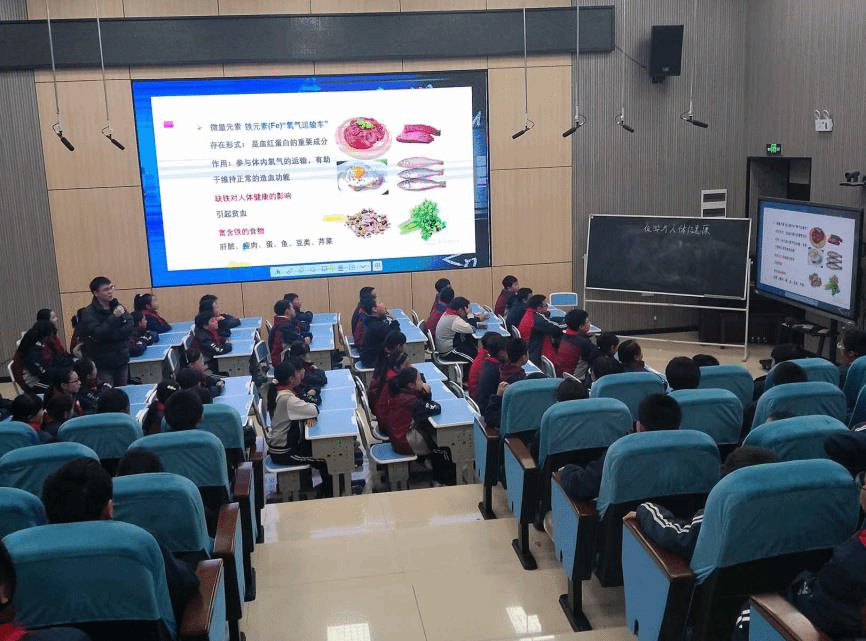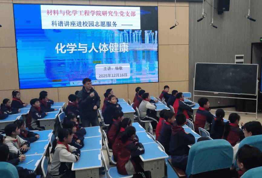 与此同时,在录播室,五年级的同学们正沉浸在研究生党支部杨敬同志带来的《化学与人体健康》世界中。杨敬同志从日常生活中的“高钙”“补铁”食品入手,揭秘人体这座“化学工厂”的奥秘,讲解了钙、铁等元素如何充当“建筑工人”“氧气运输车”来维持身体健康,也警示了重金属的危害。同学们惊讶于化学与自身如此密切相关,纷纷表示要好好吃饭,不挑食,做自己健康的小主人。