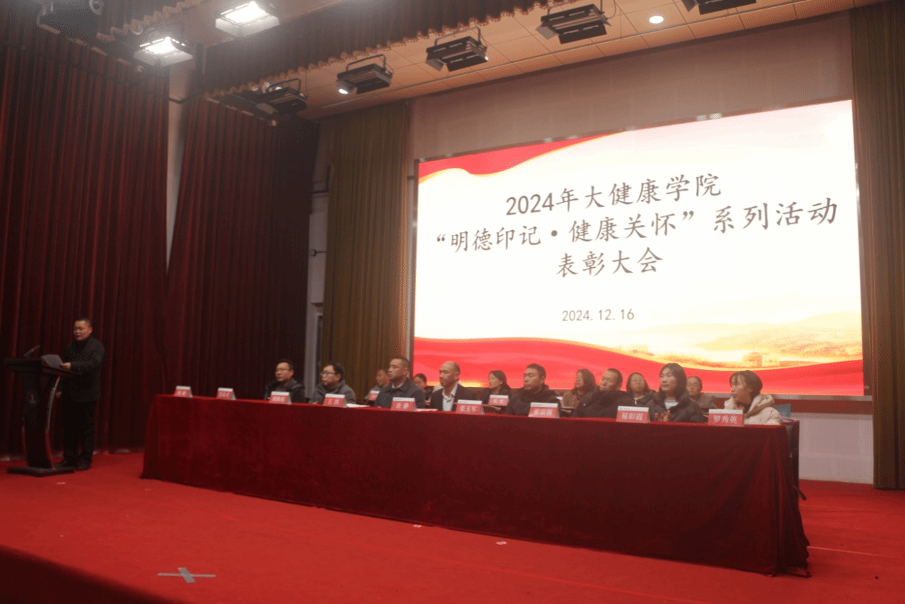 2024年12月16日晚7点,大健康学院召开2024年度“明德印记·健康关怀”系列活动表彰大会。出席本次表彰大会的有大健康学院党委书记、院长余静、党委副书记王洪、副院长徐路、大健康学院各科室负责人以及各班班主任、辅导员等,表彰大会由副院长徐路主持。会上党委副书记王洪宣读“明德印记,健康关怀”系列活动表彰文件以及通报大健康学院学生2024年国家级奖项、省级奖项获奖情况。接着由参会领导和老师分别为获奖学生颁发了“明德印记,健康关怀”系列活动荣誉证书,颁发奖项包括三书比赛、排球比赛、迎新篮球赛、微团课比赛、护理技能大赛、学风建设系列活动、足球比赛、大健康学院第五届田径运动会等奖项。