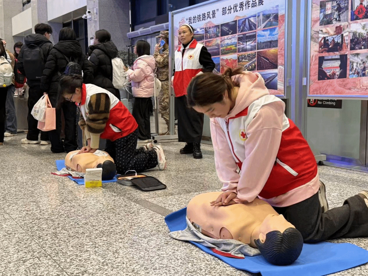 活动现场,师生志愿团队结合春运人员密集、突发状况多的特点,围绕心肺复苏(CPR)、自动体外除颤仪(AED)操作、海姆立克急救法三大核心内容开展教学。老师从急救原则、操作要点入手细致讲解,学生志愿者则以心肺复苏模型为教具,完整演示心肺复苏全流程,将意识判断、紧急呼救、胸外按压、开放气道、人工呼吸等每一步规范动作清晰呈现,同时针对按压深度、频率等关键细节反复示范,拆解实操中易出现的误区,让现场群众快速理解核心要领。