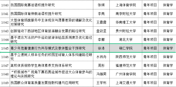 徐涛副教授获批的国家社会科学基金项目青年项目题目为《青少年危害健康行为共存模式及教体整合干预研究》,项目经费为20万。该项目以青少年危害健康行为为研究对象,重点关注了青少年危害健康行为发生特点与规律,采用结构方程模型分析法、社会网络分析法、荟萃分析法、潜在类别分析法等多学科综合研究方法,不仅归纳总结危害健康行为共存特征,明晰共存影响因素的构成及各因素的作用强度和效应,了解各因素交互作用的机制,在理论上弥补共存影响因素研究的不足,丰富和完善青少年危害健康行为理论体系,而且尝试针对青少年危害健康行为共存特征开展教体整合干预研究,以高危共存模式组标志性行为为干预关键点,构建危害健康行为分级分类的教体整合干预模式,综合评估干预模式效果,提供了青少年危害健康行为教体整合干预研究的新思路,为教体整合促进青少年体质健康创新研究提供理论支持和实践成果。