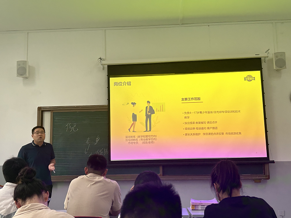 招聘会上,倪经理首先介绍了呈康体育的发展历史、公司规模和经营状况,并分析了国家体育产业的发展前景。他说,国人越来越重视身体健康,体育产业在未来有更广阔的发展空间。接着,倪经理介绍了公司的薪资待遇和福利,以及岗位要求。他鼓励同学们走出去,到一线城市寻求更大的发展空间,也表达了将会与大健康学院的优秀学子在铜仁合作开展培训机构的设想。