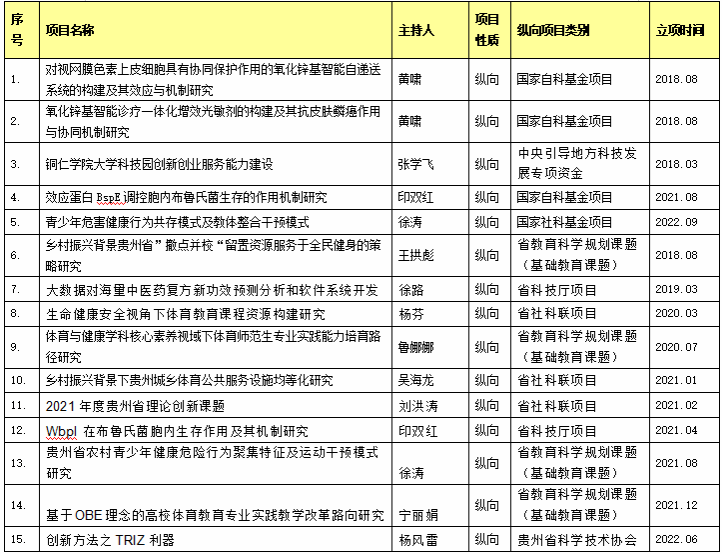 大健康学院自组建以来,重视科研队伍建设, 近年来,我院教师积极投身科研事业,科研成果数量、质量稳步提升。近5年来,大健康学院教师承担各种科研课题近50项,获3项国家自然科学基金项目和1项国家社科基金项目和10余项省部级科研基金项目资助,总经费510余万元。获第十五届贵州省青年科技奖1项,贵州省教育科学研究优秀成果奖二等奖1项,贵州省第十三次哲学社会科学优秀成果奖二等奖1项,贵州省第九届高等教育教学成果奖三等奖1项。在核心期刊发表论文40余篇,SCI10余篇。主编教材和专著30余部。