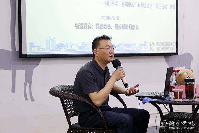 叶丹引用习近平总书记在纪念五四运动100周年大会上的重要讲话,勉励大家要珍惜韶华、不负青春,努力学习,掌握科学知识,提高内在素质,锤炼过硬本领,塑造成一个思维视野、思想观念、认识水平都能跟上时代发展的新青年。作为铜院学子,还要发扬明德精神,涵养厚重、灵性、担当的大山品格,树立好人生价值观,成为一个德智体美劳全面发展的新型青年。