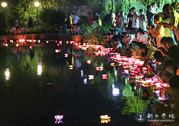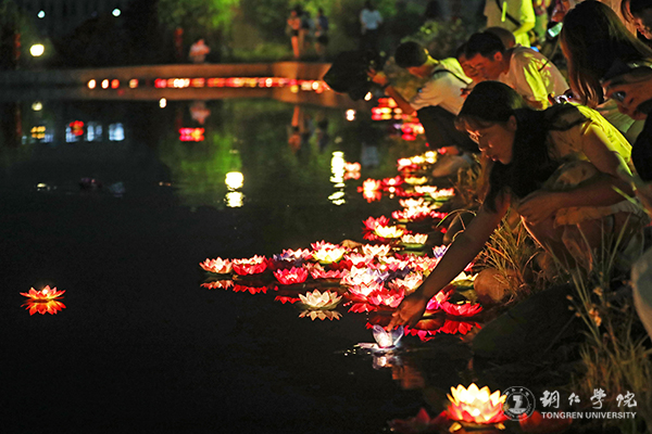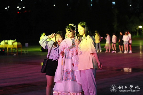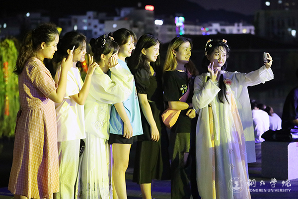 活动中,同学们的精彩表演,一度将现场气氛推向高潮,引得在场观众掌声频频。多数同学身着汉服、唐装等传统服饰行走在明德湖畔,再现了中华传统服饰文化的别致美。诗朗诵、游园诗会、汉服展示、放灯祈福等构成了一幅祥和安宁的中秋图景,似在还原着古时传统中秋佳节的和谐民生图。期间主持人准备的游戏环节更是幽默风趣、爆笑连连,根据“花”“月”“江”等与中秋节相关的字即兴朗诵或赋诗一首、猜灯谜、送上你对铜院的祝福等环节,无一不考验着同学们的文学功底和知识储量。全场师生还在汉服社同学的带领下跳起汉服集体舞,共同感受中华优秀传统文化的独特魅力。同时,现场还派发了bv伟德国际1946学生团队自制的“校徽”月饼,更是引得在场师生的青睐。
