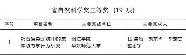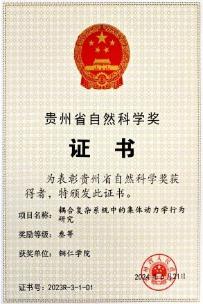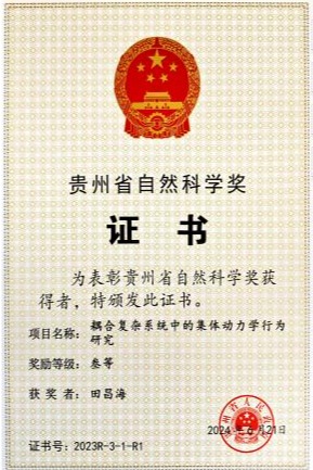 近日,贵州省人民政府发布了《关于2023年度贵州省科学技术奖励的决定》,伟德官网田昌海博士完成的项目《耦合复杂系统中的集体动力学行为研究》荣获贵州省自然科学奖三等奖。该奖由bv伟德国际1946和华东师范大学联合申报,bv伟德国际1946为第一完成单位,主要完成人为田昌海、刘宗华、毕宏杰、霍思宇。