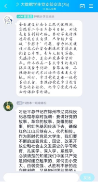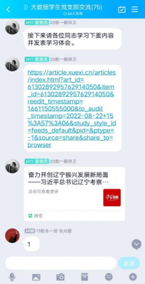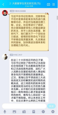 为了学习宣传贯彻习近平总书记在辽宁考察时的殷勤嘱托。8月23日15点,大数据学院学生党支部在支部学习群开展八月份线上党课,本次党课由戴祥卫同志主持,大数据学院全体党员、发展对象以及入党积极分子参加学习。