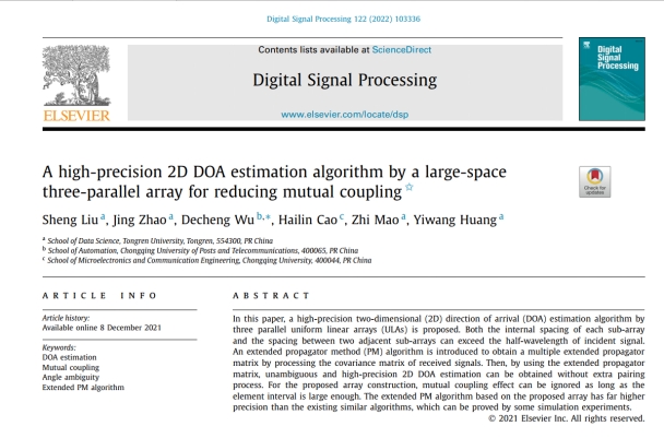 近日,大数据学院教授、工学博士刘声老师的论文《A high-precision 2D DOA estimation algorithm by a large-space three-parallel array for reducing mutual coupling》在SCI(2区)期刊《Digital Signal Processing》,2022年第4期上发表。论文提出了一种大间距三平行阵列结构,这种结构的所有阵元间距可以远超过入射信号的半个波长,对阵元间的互耦效应有很强的鲁棒性,并且针对这种大间距阵列提出了一种高分辨的二维方向角估计算法,其估计精确度远超出了同类型其它算法。