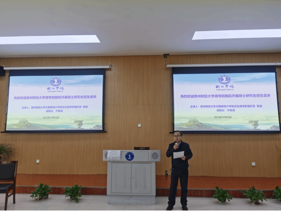 2023年10月20日上午9:00在博思楼105开展宣讲会 ,贵州财经大学大数据统计学院正处级专职组织员陈波、副院长于桂海一行莅临我院开展硕士研究生招生宣讲。大数据学院计算机、数据科学、数学与应用数学、统计专业的学生参加了宣讲会,本次宣讲会由大数据学院黄贻望副院长主持。