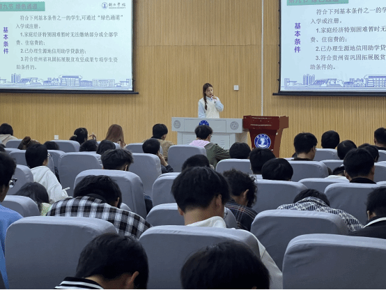 讲座伊始,大数据学院资助宣传大使罗琳幽分别从“奖”“助”“贷”“勤”“补”“免”六个方面详细介绍了家庭经济困难学生认定、国家奖学金、国家励志奖学金、国家助学金、专业奖学金、贵州省巩固拓展脱贫攻坚成果专项学生资助、服兵役高等学校学生国家教育资助、临时困难补助、学费减免、生源地信用助学贷款、勤工助学、绿色通道、省属普通高校基层就业学费补偿国家助学贷款代偿等项目的申请条件、申请流程以及注意事项,她讲到国家和学校资助政策设立的原因和意义在于“不让任何一个学生因家庭经济困难而失学”。她引导同学们要常怀感恩之心,诚信做人,牢记国家的资助、社会的帮助,自强自立,在国家、社会、学校的帮助下努力学习,提高自身综合素养,回报国家,回报社会,成为一个德智体美劳全面发展的社会主义建设者和接班人。