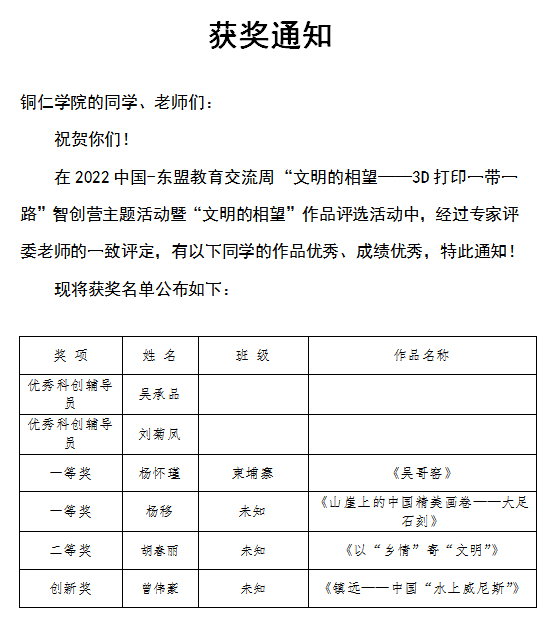 近日,接2022中国-东盟教育交流周“文明的相望——3D打印一带一路”智创营组委会通知,伟德官网报送的4个参赛作品全部获奖。其中,国际学院柬埔寨籍杨怀瑾同学的《吴哥窟》、教育学院杨移同学的《山崖上的中国精美画卷——大足石刻》获一等奖;教育学院胡春丽的《以“乡情”寄“文明”》获二等奖;人文学院曾伟豪的《镇远——中国“水上威尼斯”》获创新奖。吴承品、刘菊凤两名指导老师获优秀科创辅导员。