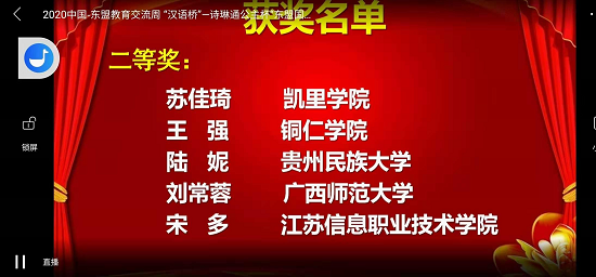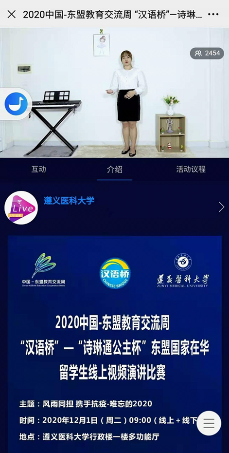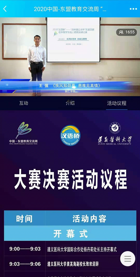 12月1日上午,2020年中国-东盟教育交流周“汉语桥”——“诗琳通公主杯”东盟国家在华留学生线上视频演讲比赛在贵州遵义医科大学顺利举办。