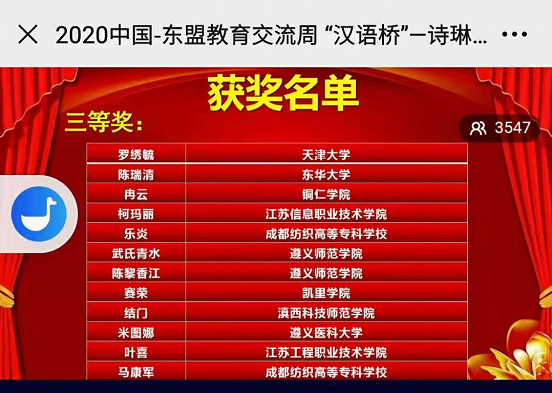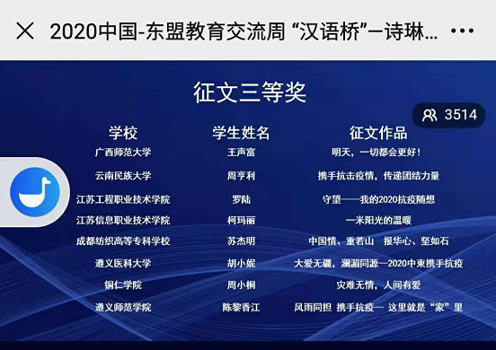 同时,大赛公布了2020年中国-东盟教育交流周“风雨同担,携手抗疫”东盟国家留学生征文比赛获奖结果,伟德官网2017级金融工程专业国际学生周小桐、2019级商务英语专业国际学生王强在本次征文比赛中分别荣获三等奖、优秀奖。