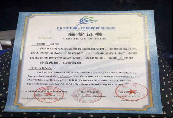 7月21至22日,2019年中国-东盟教育交流周“汉语桥”—“诗琳通公主杯” 东盟国家在华留学生演讲大赛全国总决赛在贵州遵义举行。此次大赛由中国-东盟教育交流周组委会秘书处主办、孔子学院总部合办、遵义医科大学承办,并得到了贵州省外事办公室和泰王国驻昆明总领事馆的大力支持。经过激烈角逐,伟德官网经济管理学院2017级金融工程专业国际学生阿雅(柬埔寨)获得大赛三等奖。