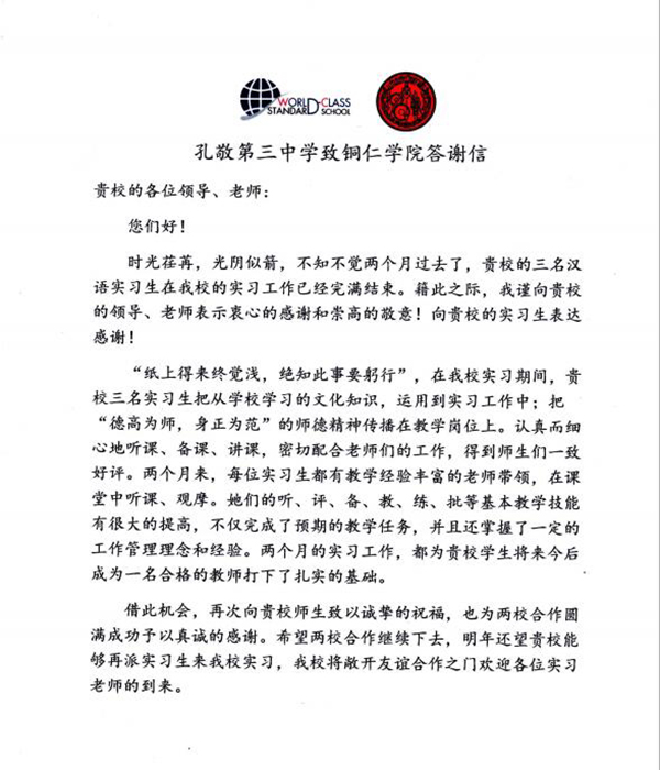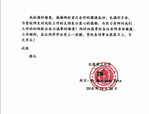 近日,伟德官网收到海外实习合作学校泰国孔敬第三中学发来的答谢信。信中对伟德官网派遣学生前往该校进行实习表示感谢,对伟德官网国际学院2015级的三位实习生,冯琴芬、陈红、李倩倩的实习情况提出肯定与表扬。
