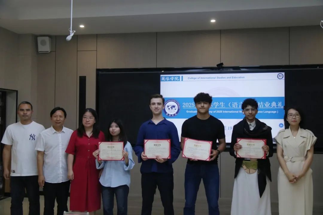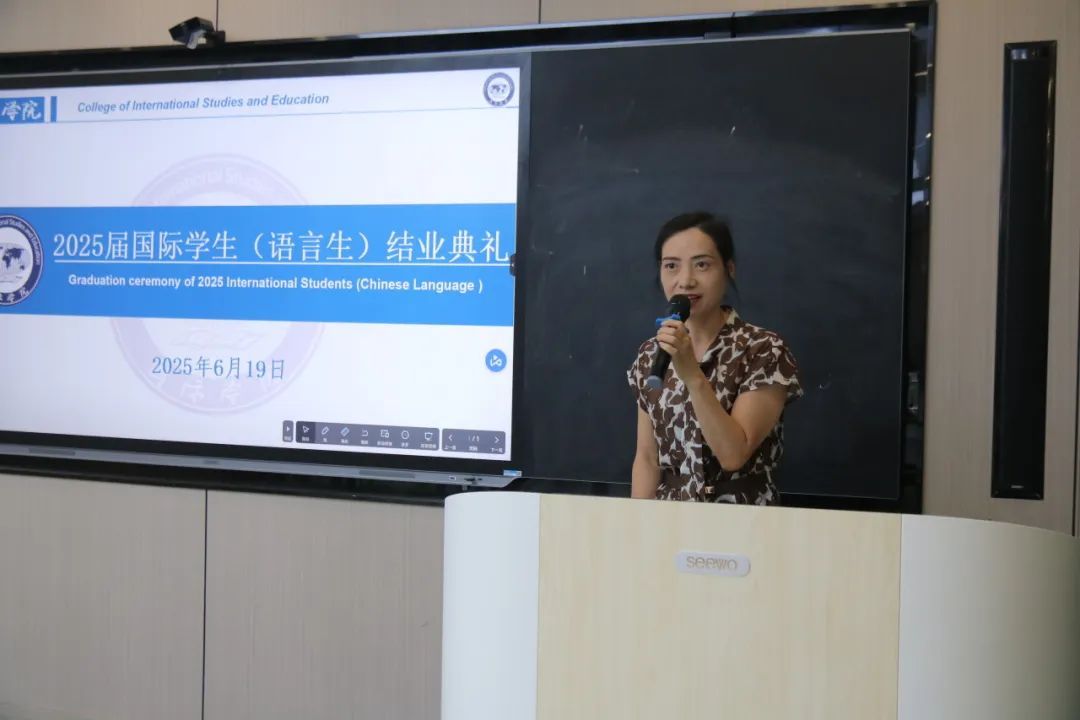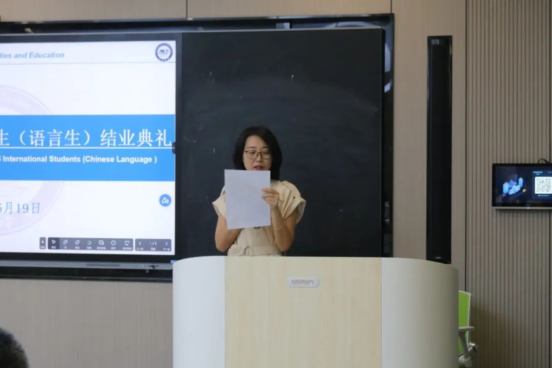 2025年6月19日上午10时,在bv伟德国际1946国际学院301智慧教室,举行了2025届国际学生(语言生)的结业典礼。国际合作与交流处处长刘姗、国际学院党委书记张志会、国际学院党委副书记鲁芮汐、国际学院党政办主任雷远东、国际学院国际教育系全体教师以及来自俄罗斯、孟加拉、巴基斯坦、塔吉克斯坦等18个国家的共计56名汉语言进修国际学生出席了典礼。