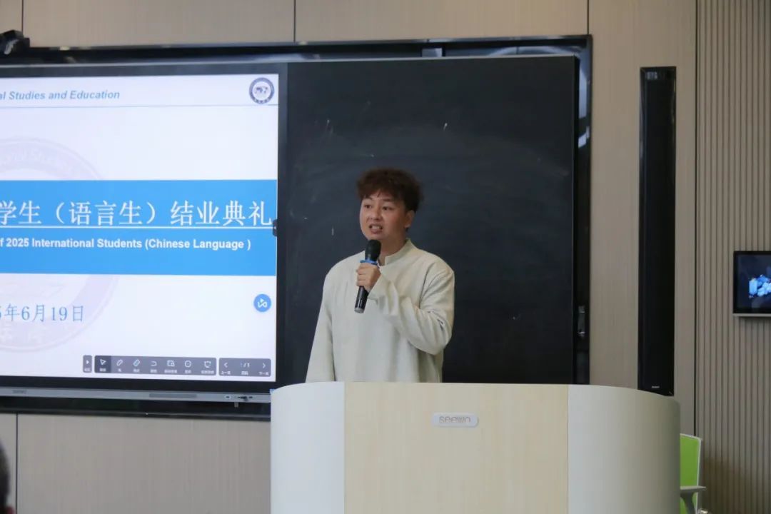 张志会书记首先代表学院向圆满完成学业的国际学生致以热烈祝贺。他深情回顾了56名学子的学习历程:“从初到中国时的局促不安,到如今自信流畅的中文表达;从对中华文化的陌生好奇,到主动参与包粽子、写春联等传统活动——你们用努力与热情,在bv伟德国际1946这片土地上留下了鲜明的成长印记。”他强调,语言学习不仅是技能的提升,更是文化认同的深化。张书记寄语大家将这段宝贵的求学经历化作未来人生道路的奋进力量,持续深化对中华文化的理解,成为中外交流的友好使者。