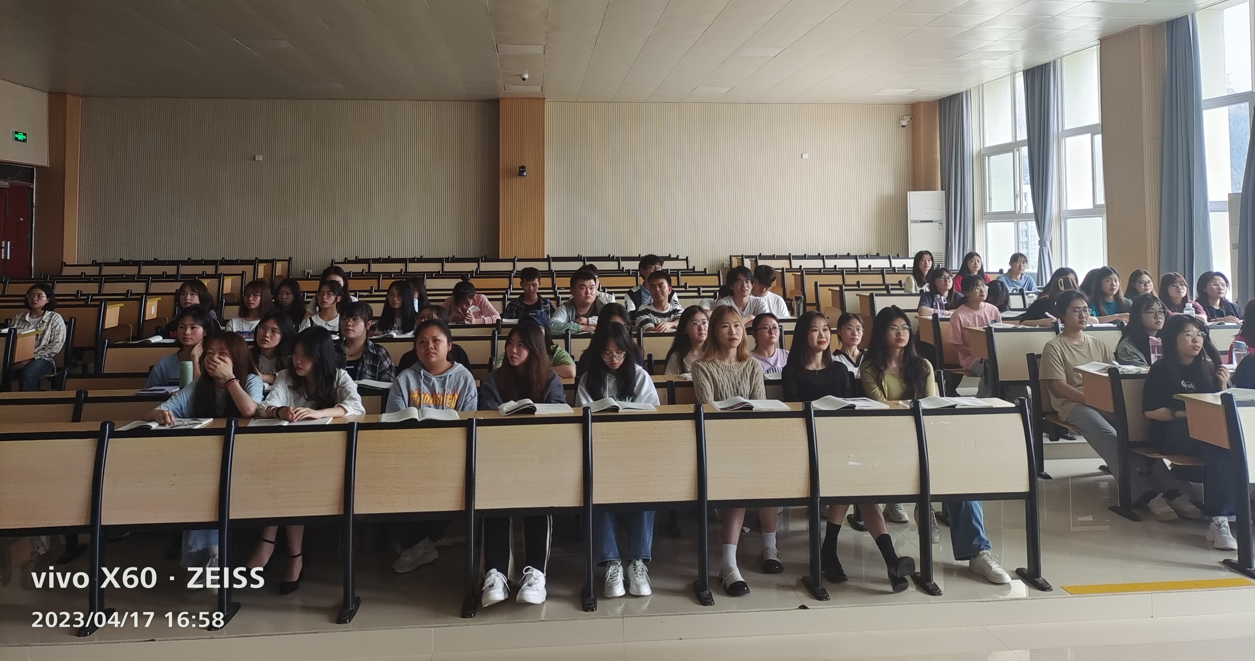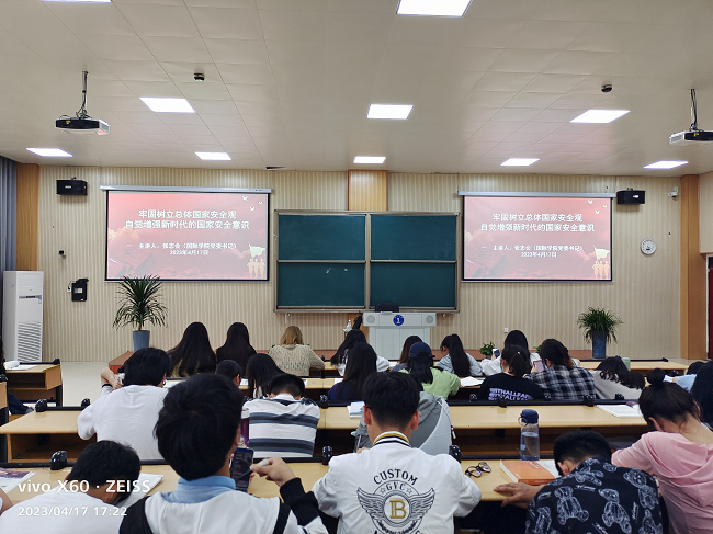 4月17日,国际学院组织2022级英语专业3班、4班和视觉传达与设计1班在博思楼302教室听讲“国家安全教育”专题思政课。