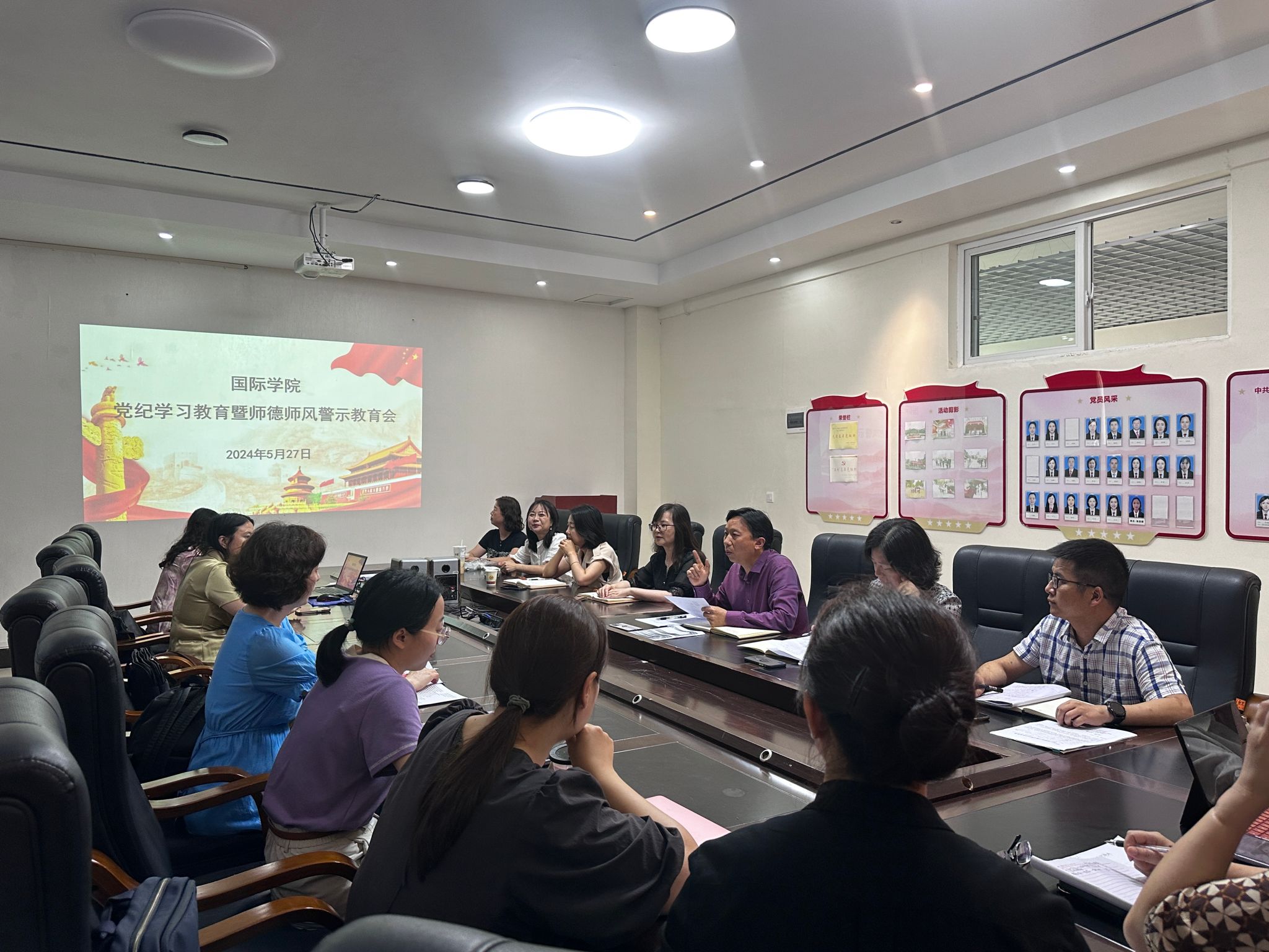 5月27日下午,国际学院在明理楼A三楼会议室召开党纪学习教育暨师德师风警示教育会。会议由院党委书记张志会主持,全体教职工参加会议。