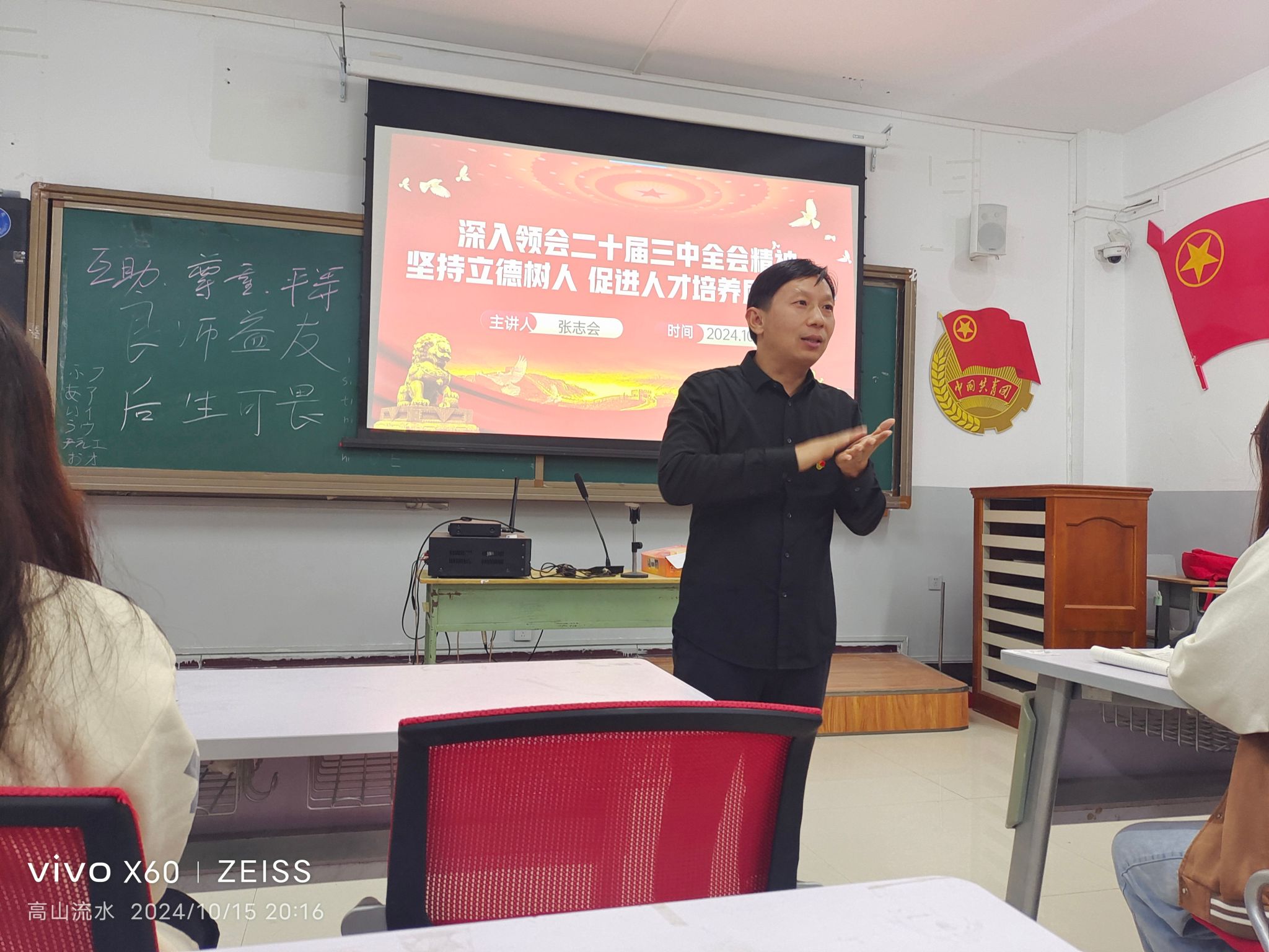 为深入学习宣传党的二十届三中全会精神,准确把握全会精神内涵,明确目标任务,张志会以《深入领会二十届三中全会精神,坚持立德树人,促进人才培养质量提升》为题,紧紧围绕深化教育综合改革,结合学校相关工作要求,从深化教育综合改革、培养全面发展人才、推动教育改革创新、培养担当民族复兴重任的时代新人等四个方面进行宣讲,引导广大青年学生积极追求进步,坚定不移听党话、跟党走的新时代好青年。