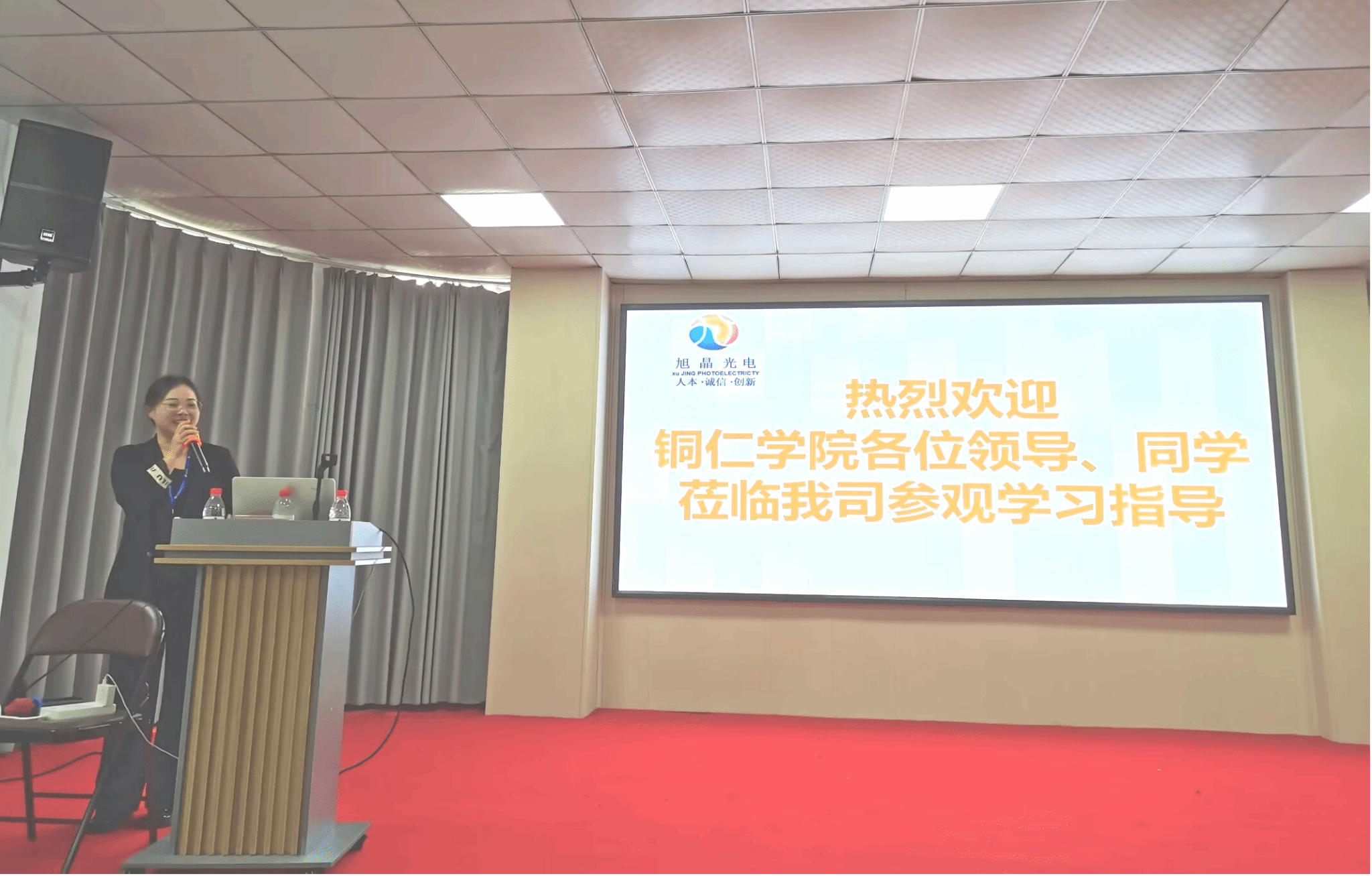 见习第一站是贵州铜仁旭晶光电有限公司。该公司是专业从事光学玻璃镀膜、镀膜工艺技术研发、冷加工、底座贴合的生产和销售集于一体的综合型公司。公司领导带领老师和学生参观并介绍了该公司的发展历程、经营理念、企业文化、企业组织架构、企业生产运营、未来发展以及公司对外贸业务员岗位的人才需求等。学生针对目前外贸行业、销售及待遇薪资等方面进行提问,公司专业负责人作了详细解答。