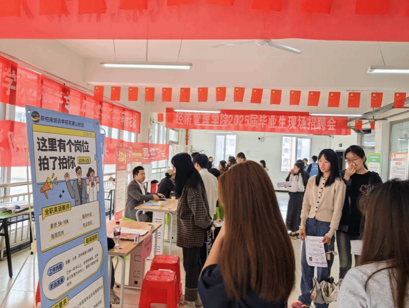 为助力毕业生高质量就业,拓宽就业渠道,5月8日,国际学院校园招聘会在孵化基地二楼大厅举行。本次招聘会邀请了5家企业参与,涵盖了教育、电商、艺术设计等多个领域,为25届毕业生提供了丰富多样的就业岗位。