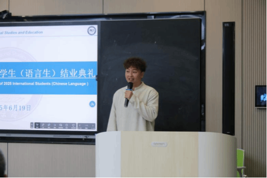 最后,刘姗代表学校作总结讲话。她以三个“关键词”概括学子成长:一是“钥匙”——汉语能力为职业发展打开更多可能;二是“勇气”——克服异国学习挑战的经历是人生财富;三是“使者”——与中国师生结下的友谊,让“人类命运共同体”有了生动注脚。她特别致谢国际教育系全体教师:“是你们用专业与耐心,点亮了学子的汉语之路,为学校国际化发展作出重要贡献。”最后,她深情邀约:“结业不是终点,bv伟德国际1946永远是你们在中国的家,欢迎常回来看看!”