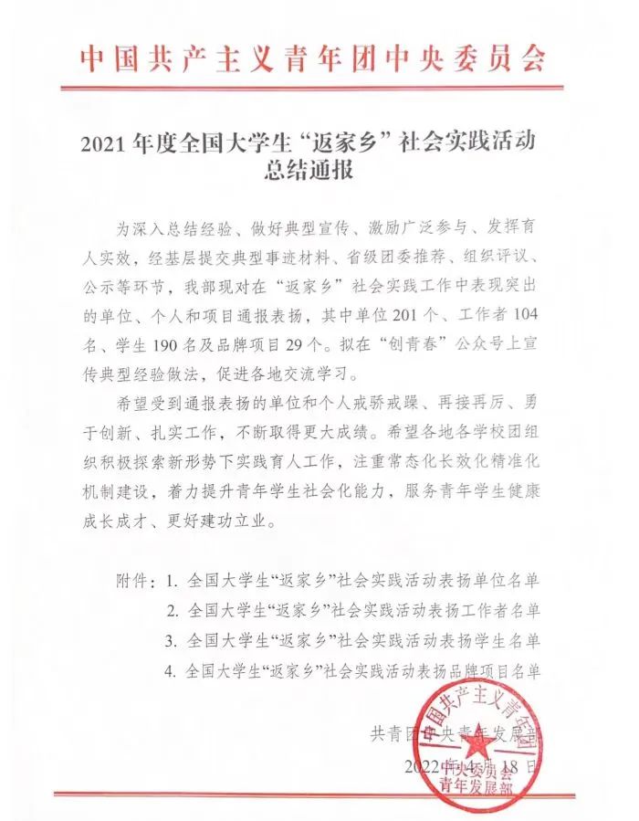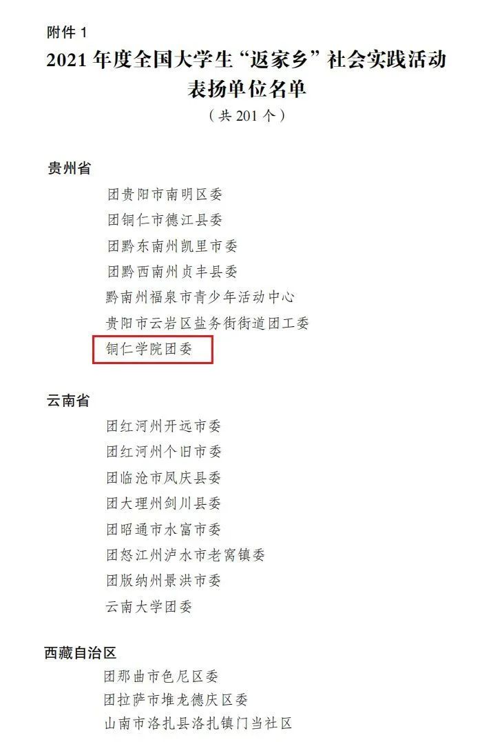 近日,共青团中央发布了2021年度大学生“返家乡”社会实践活动总结通报,对表现突出集体、个人和项目进行表扬。bv伟德国际1946团委获评2021年度全国大学生“返家乡”社会实践活动表扬单位,也是贵州省唯一荣获此表彰的高校团委。