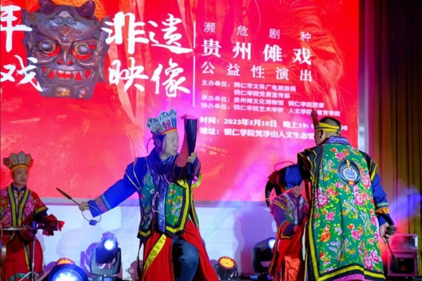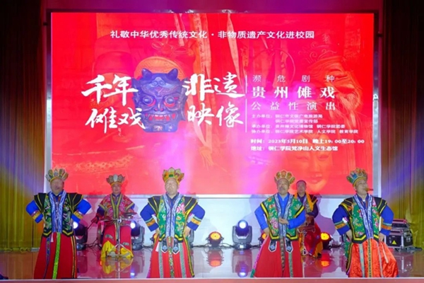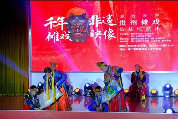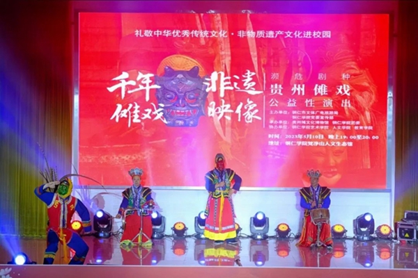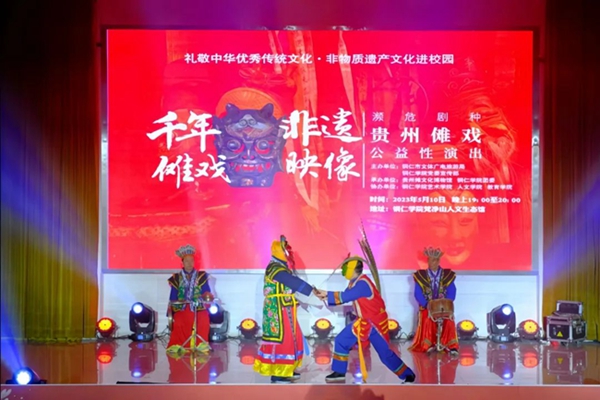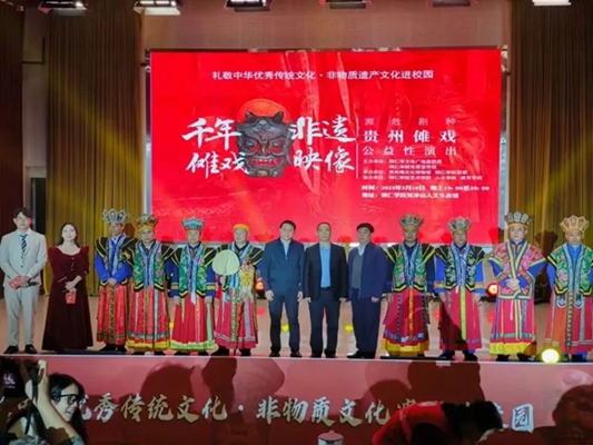 5月10日晚,“礼赞中华优秀传统文化·非物质文化遗产进校园——濒危剧种贵州傩戏公益性演出”在伟德官网梵净山人文生态馆举行。铜仁市文体广电旅游局党组成员、市文化市场综合执法支队支队长张文,贵州傩文化博物馆馆长唐治洲,伟德官网艺术学院党委书记徐美、校团委副书记张朝飞出席,师生齐聚一堂共同欣赏铜仁本地的特色非遗文化——傩戏。本次演出由铜仁市文体广电旅游局、伟德官网党委宣传部主办,贵州傩文化博物馆、伟德官网团委承办,伟德官网艺术学院、人文学院、教育学院协办。