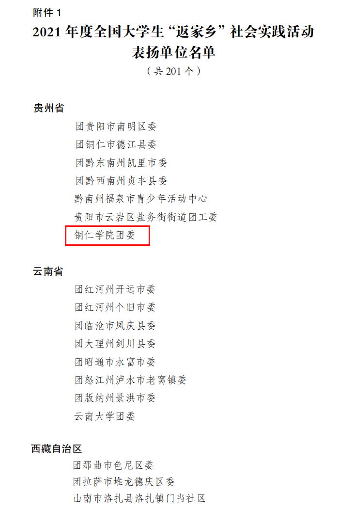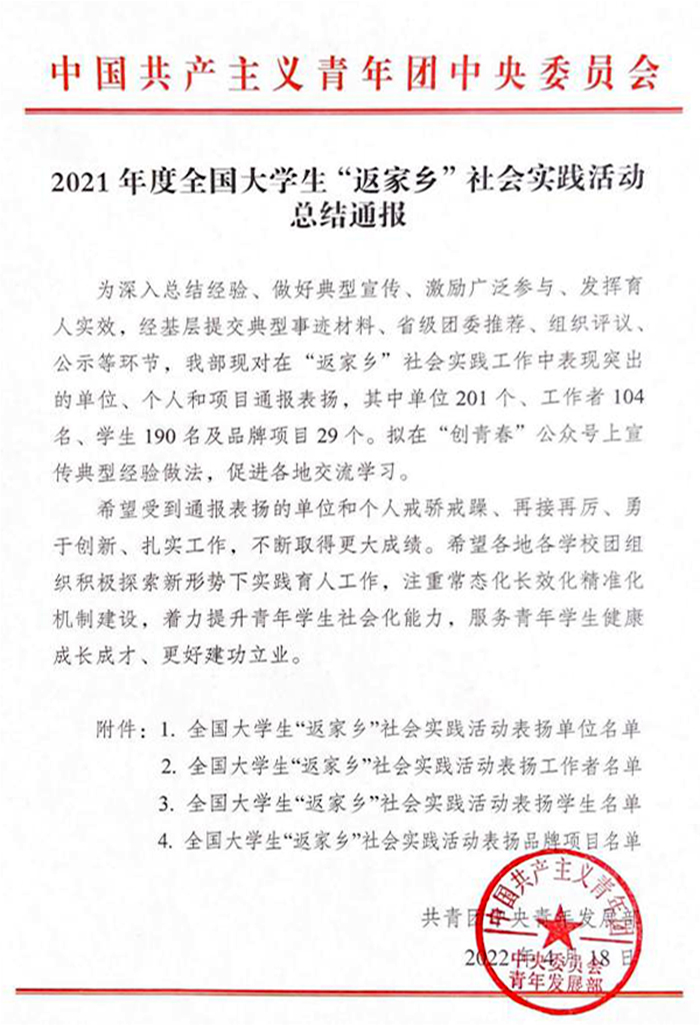 近日,共青团中央委员会发布了2021年度大学生“返家乡”社会实践活动总结通报,对表现突出集体、个人和项目进行通报表扬。bv伟德国际1946团委被列为2021年度全国大学生“返家乡”社会实践活动表扬单位,也是全省唯一获此通报表扬的高校团委。