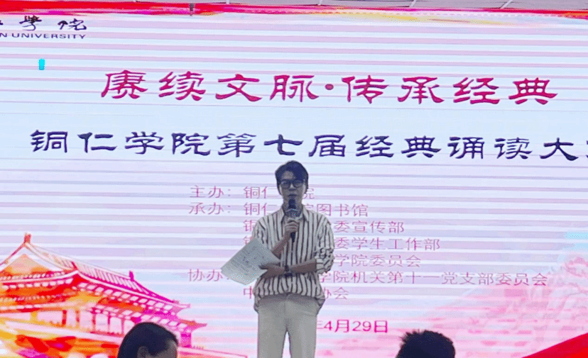 4月29日,由图书馆、党委宣传部、党委学工部、团委联合承办的bv伟德国际1946第七届“赓续文脉·传承经典”经典诵读大赛在图书馆举办。党委宣传部副部长梁光华、党委学工部副部长武国丽、团委副书记田淼、文学与传媒学院副教授刘太胜、党委学工部德育科科长黄橙紫担任评委。图书馆馆长田黎星,副馆长江腾、邹志洪,部分教职工和学生代表到场观摩比赛。