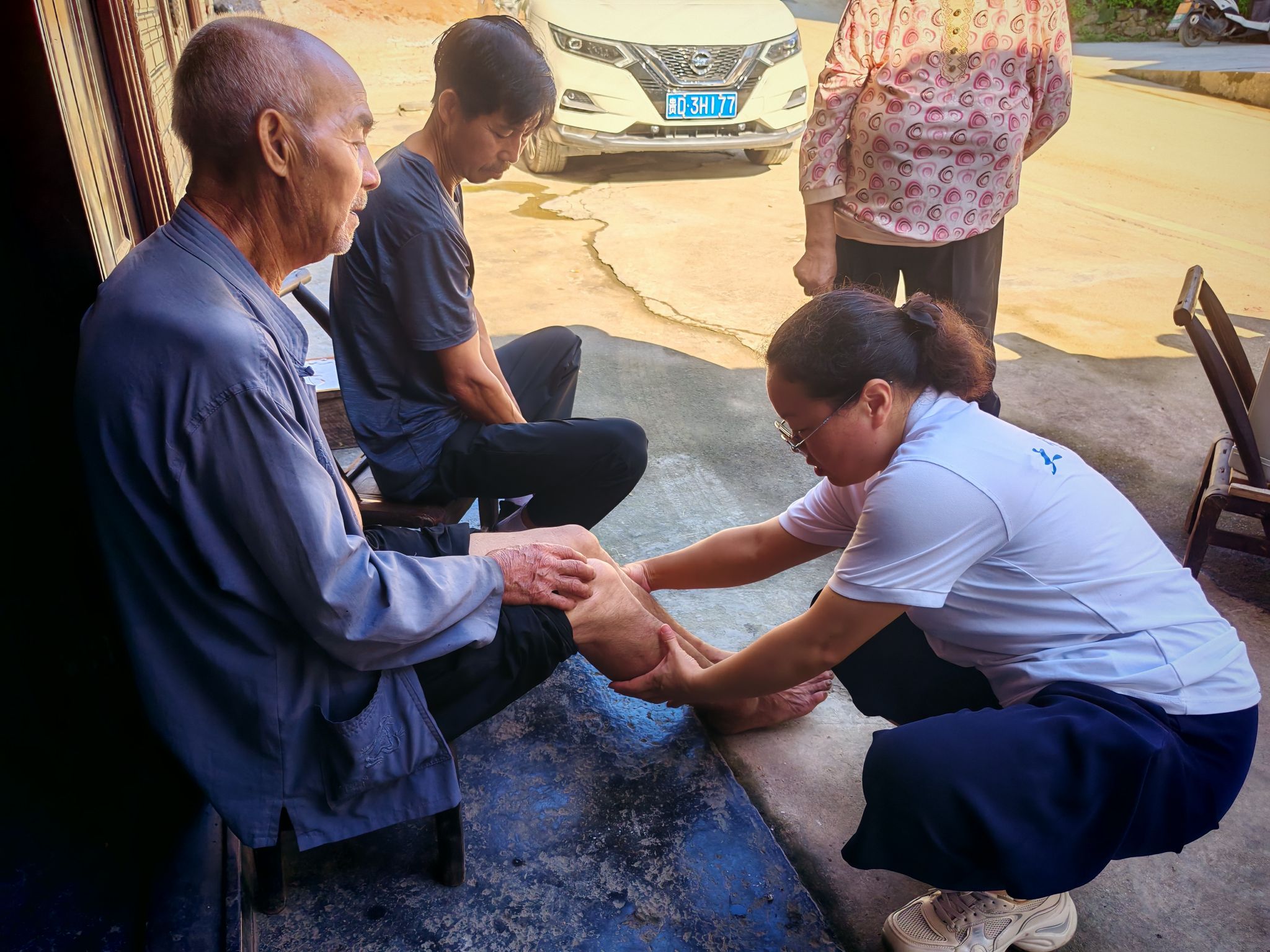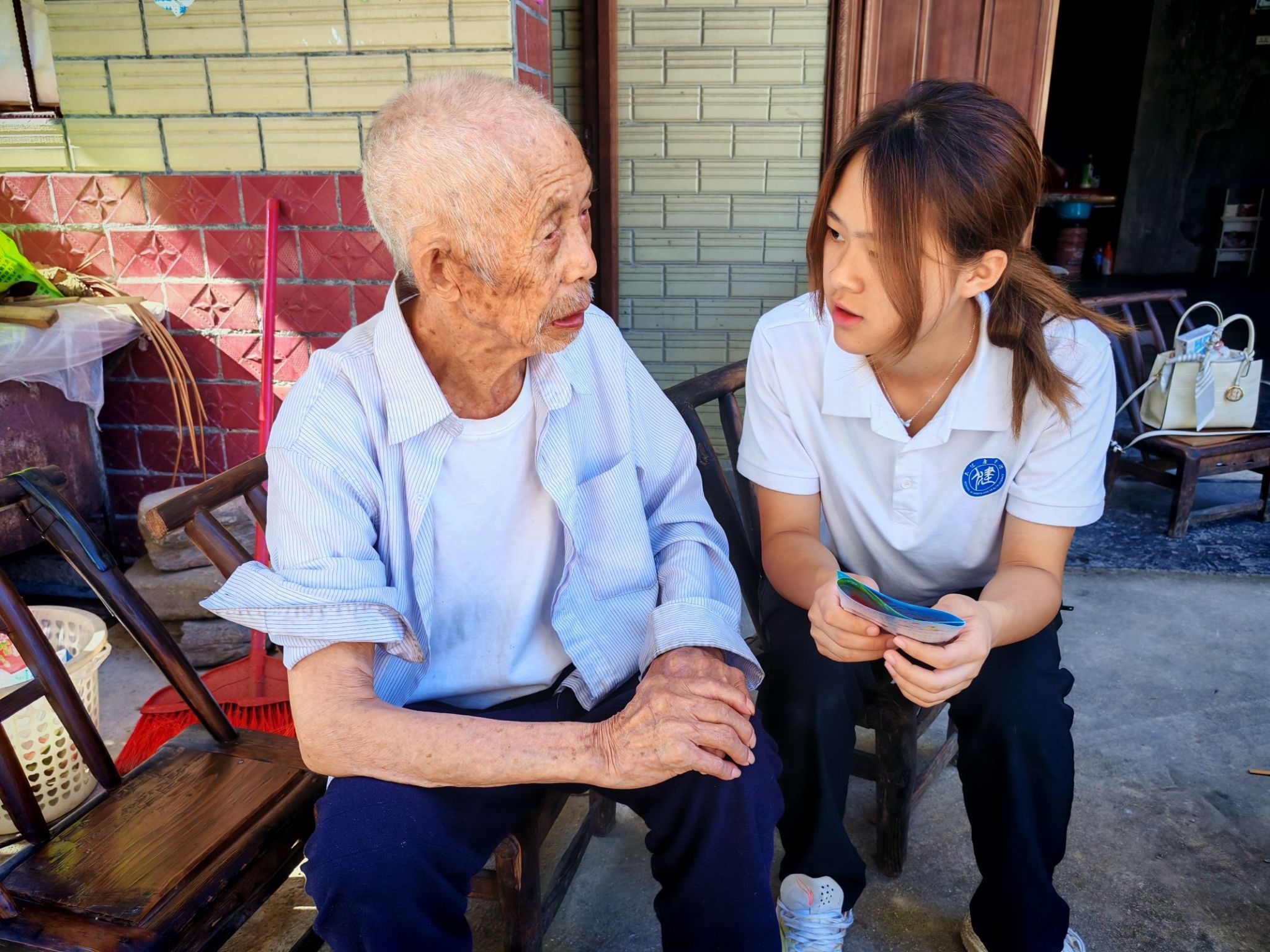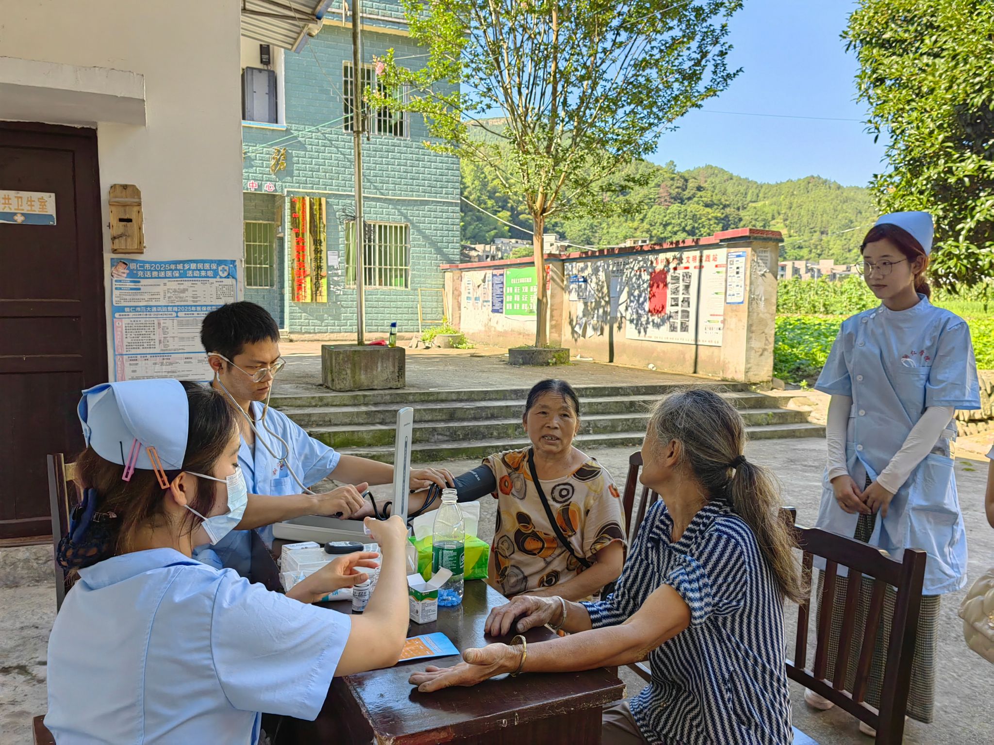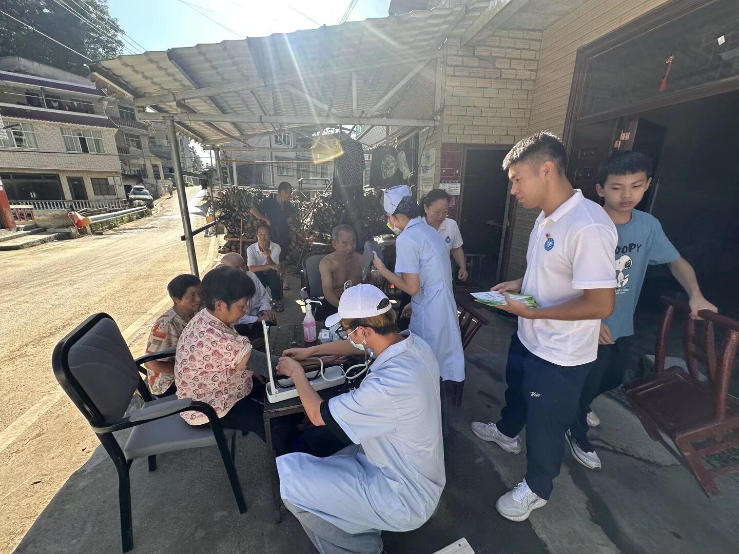 第三天上午,由大健康学院学生科郭易可老师、牛郎镇四茶园村张书记带队,护理系印双红、田芬、李寅翠、蔡春连等教师分三组深入木寨村中,带领护理系学生为村民开展免费血糖、血压检测服务,并结合健康宣教关于高血压和糖尿病的预防,将专业护理实践与乡村振兴需求深度融合。