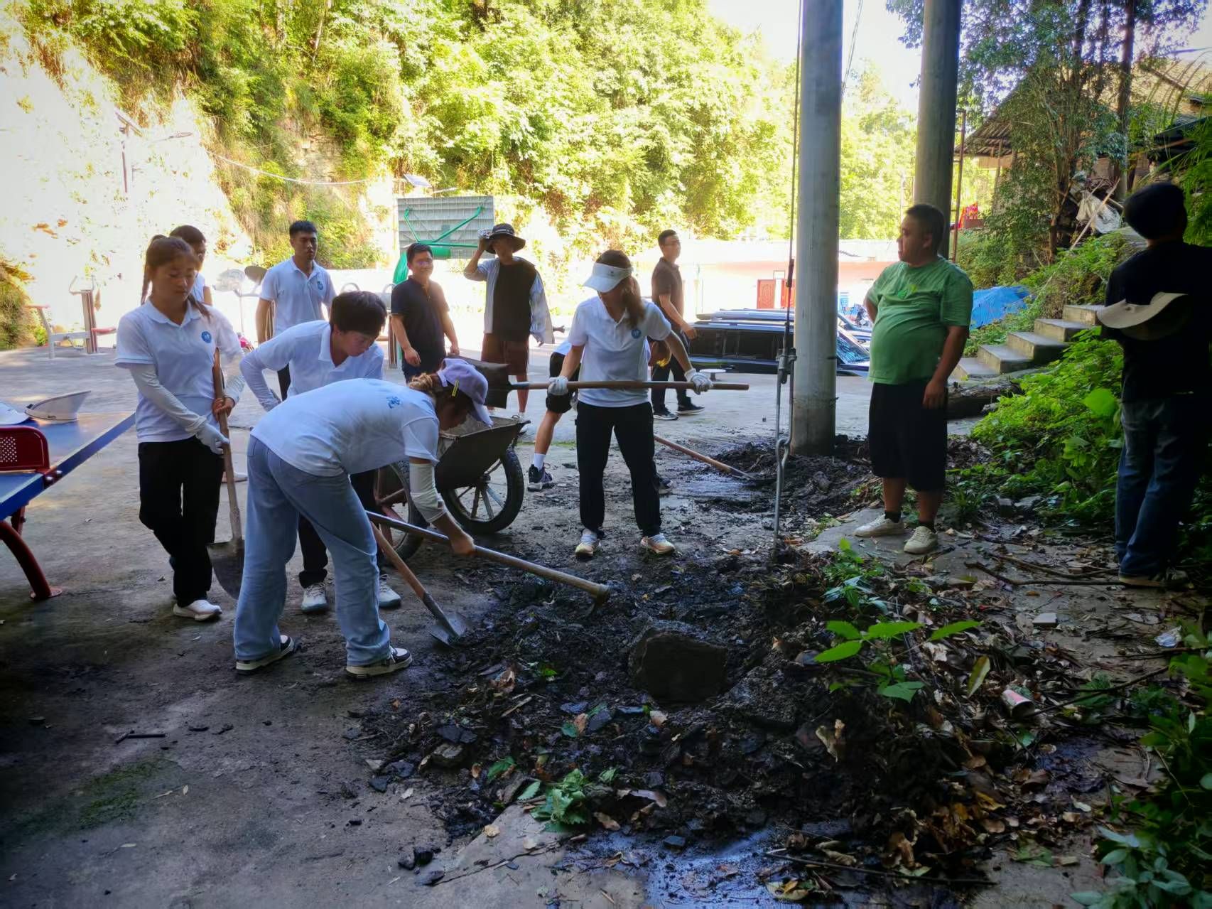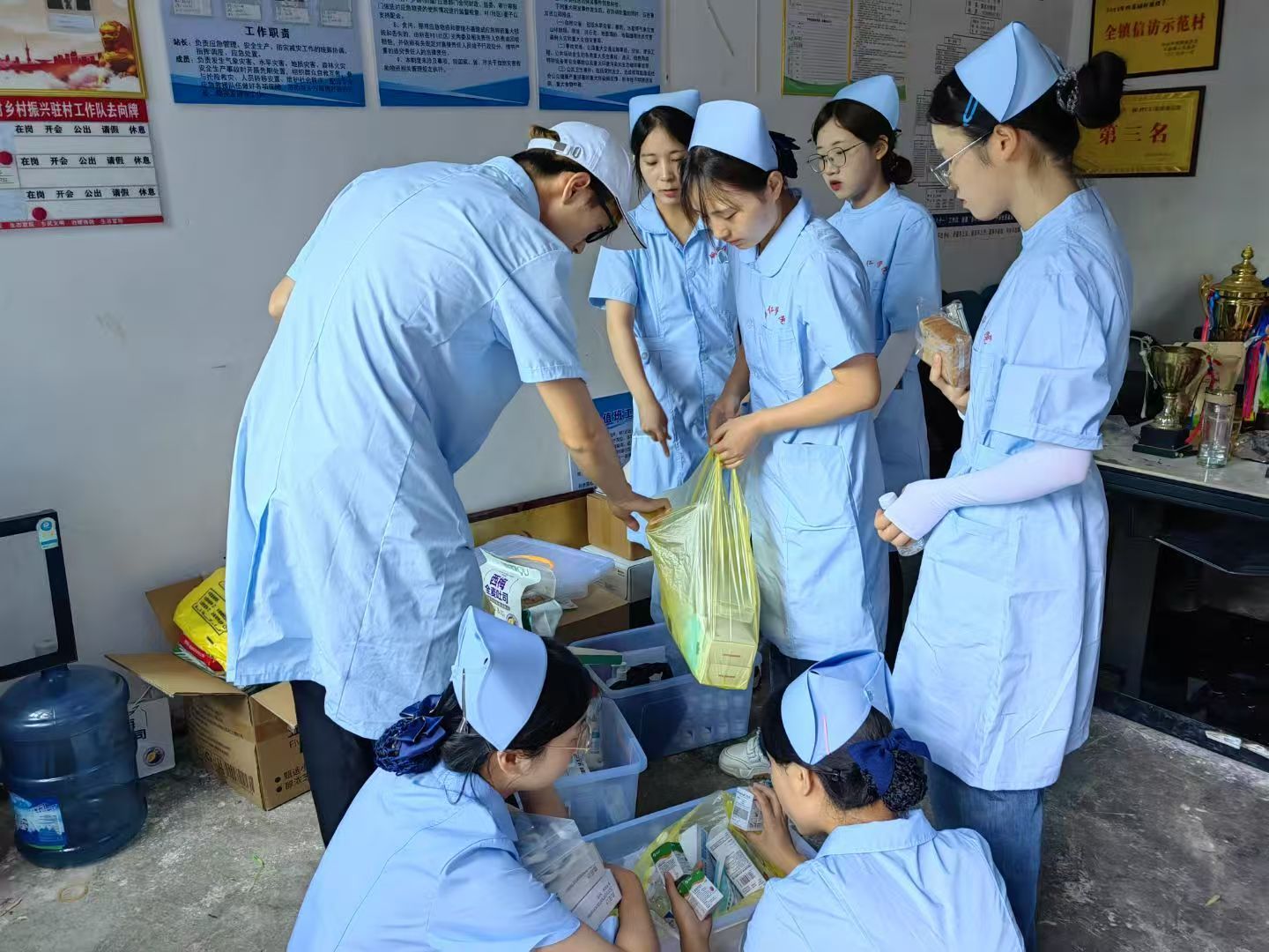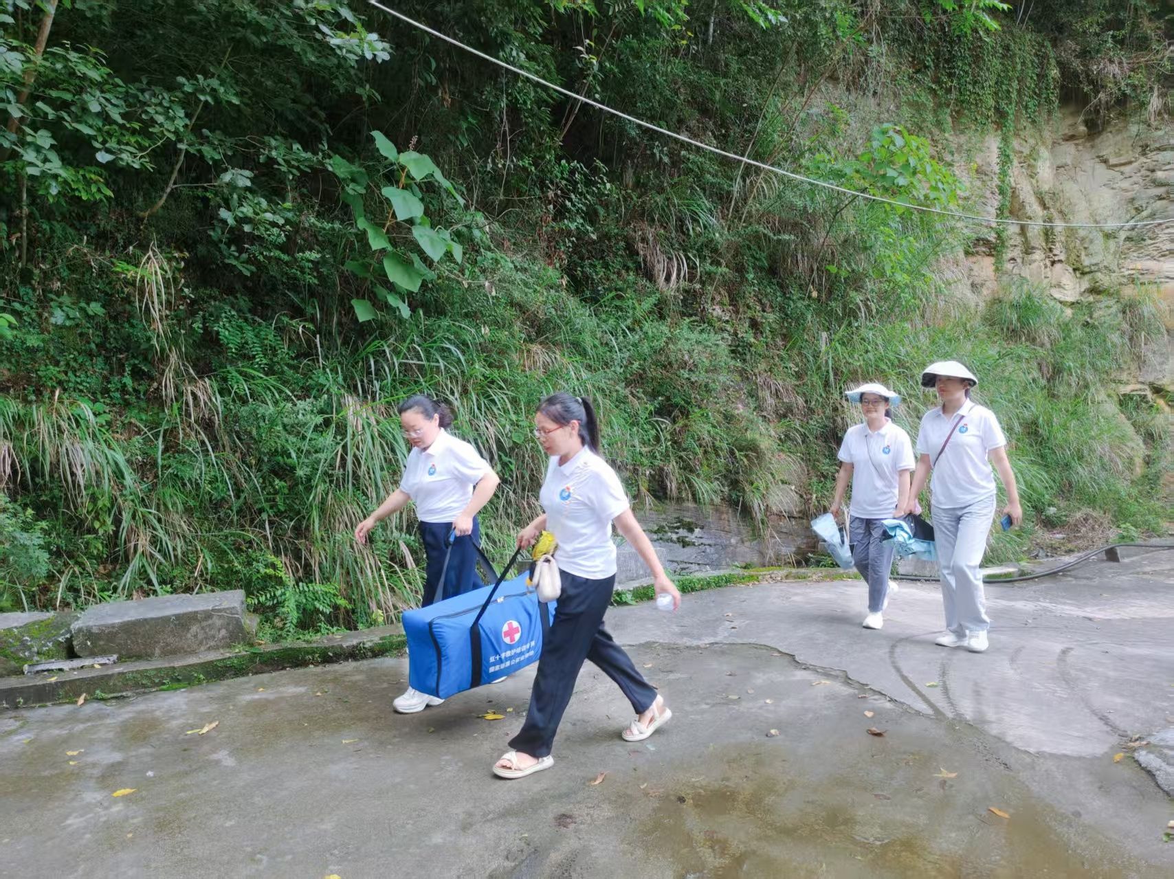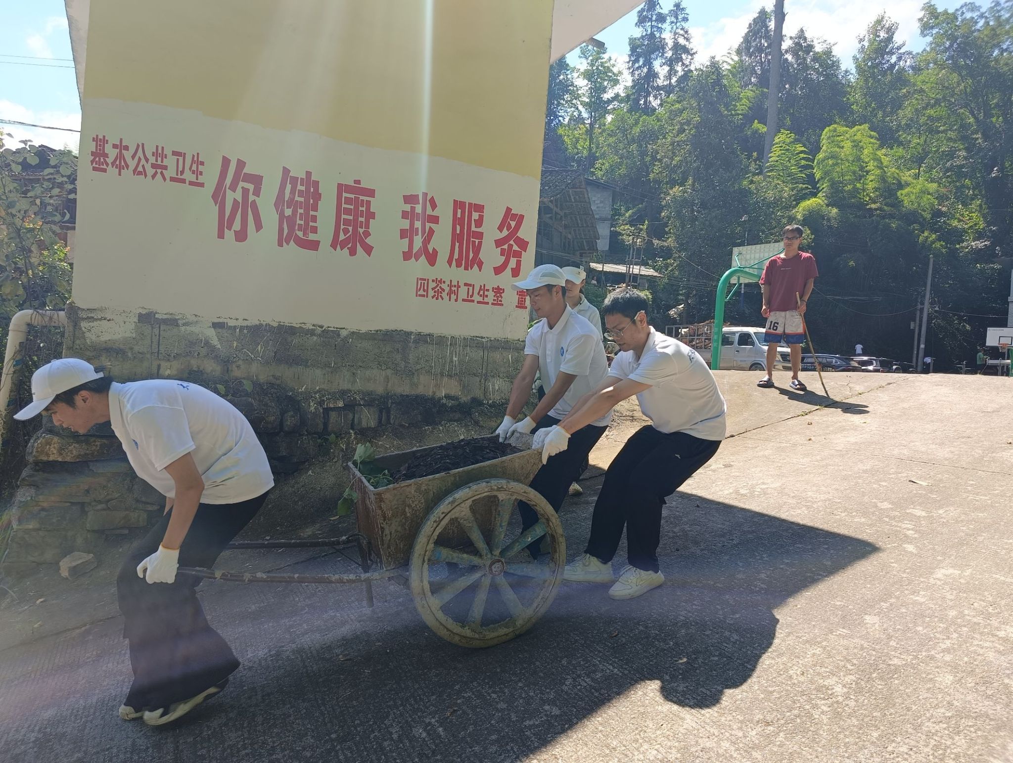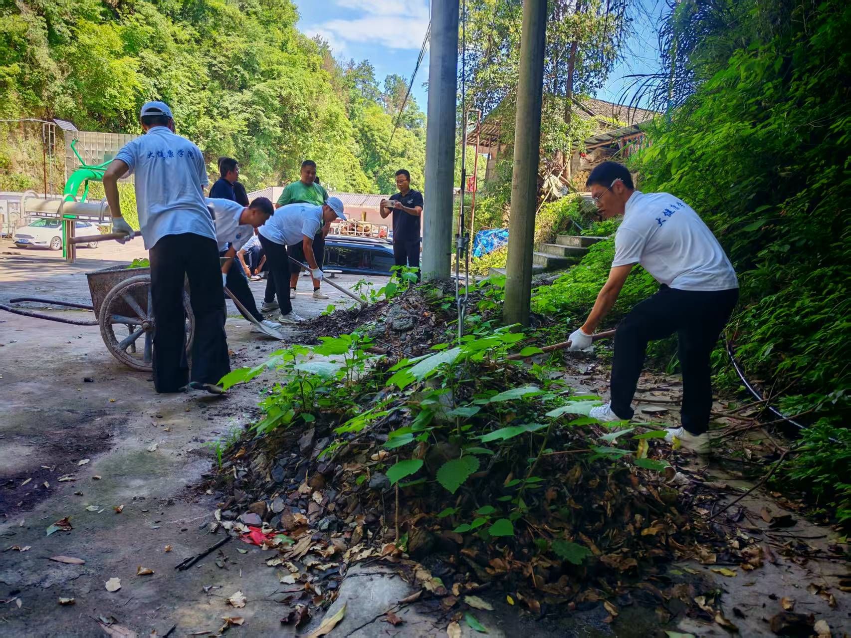 次日早上,我院实践团队分为三个小组前往四茶园村内的三个检测点,同时为当地老人开展血糖、血压检测服务。完成全部老人的健康检测后,同学们在村文化广场为村干部们开展急救技能培训,重点教授他们心肺复苏(CPR)操作方法,下午同学们化身“环境卫士”,积极投身劳动卫生工作,大家手持扫帚、铁锹、钳子等清洁工具,对村内道路、广场、沟渠等公共区域进行全面清理。