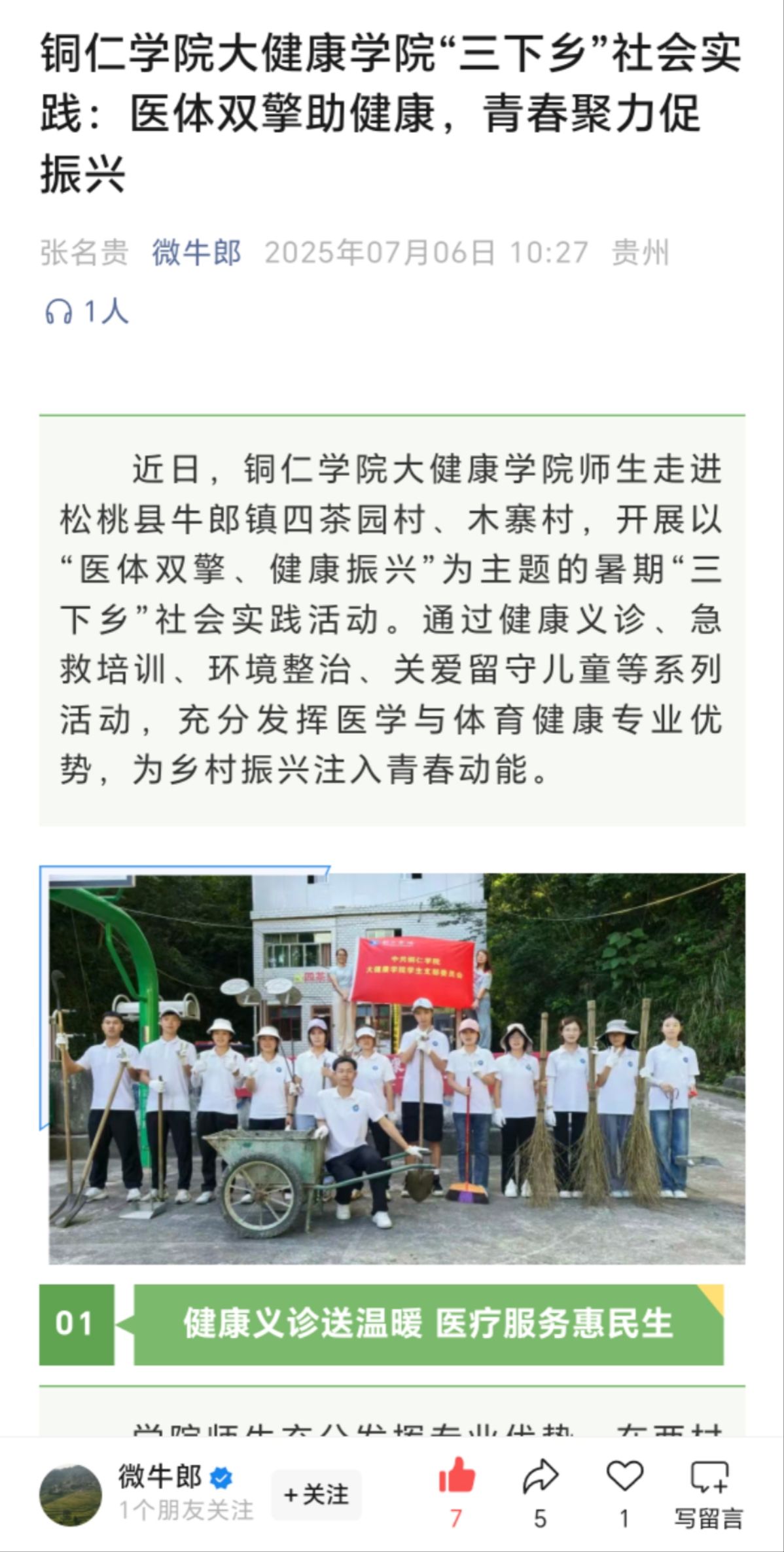 为深入学习贯彻习近平新时代中国特色社会主义思想,扎实推进乡村全面振兴,助力“健康中国”,争做有理想、敢担当、能吃苦、肯奋斗的新时代好青年。近期,由bv伟德国际1946大健康学院18名师生组成的“医体双擎·健康振兴”团队在学院领导的支持下,深入松桃苗族自治县牛郎镇开展暑期“三下乡”社会实践活动。