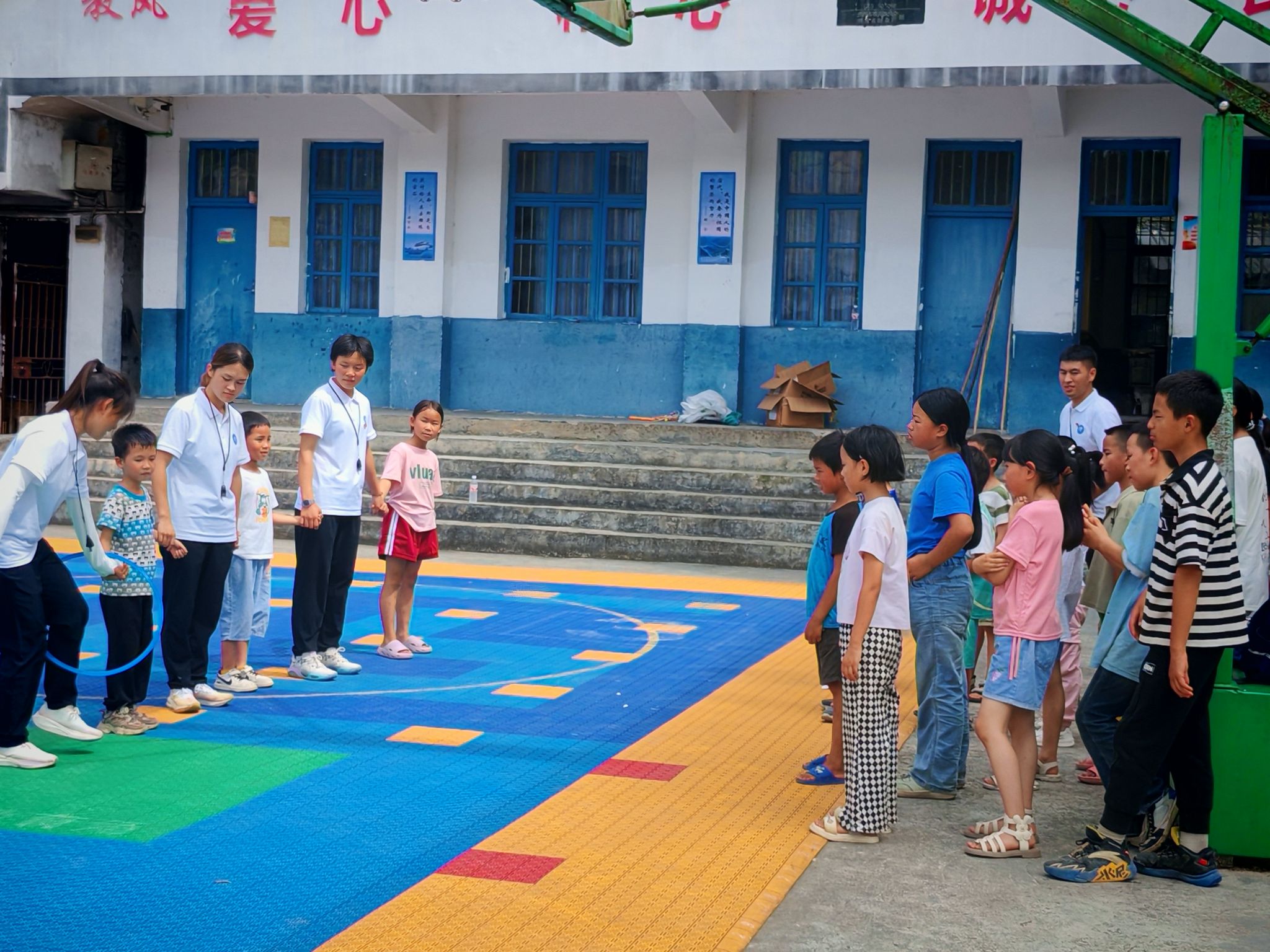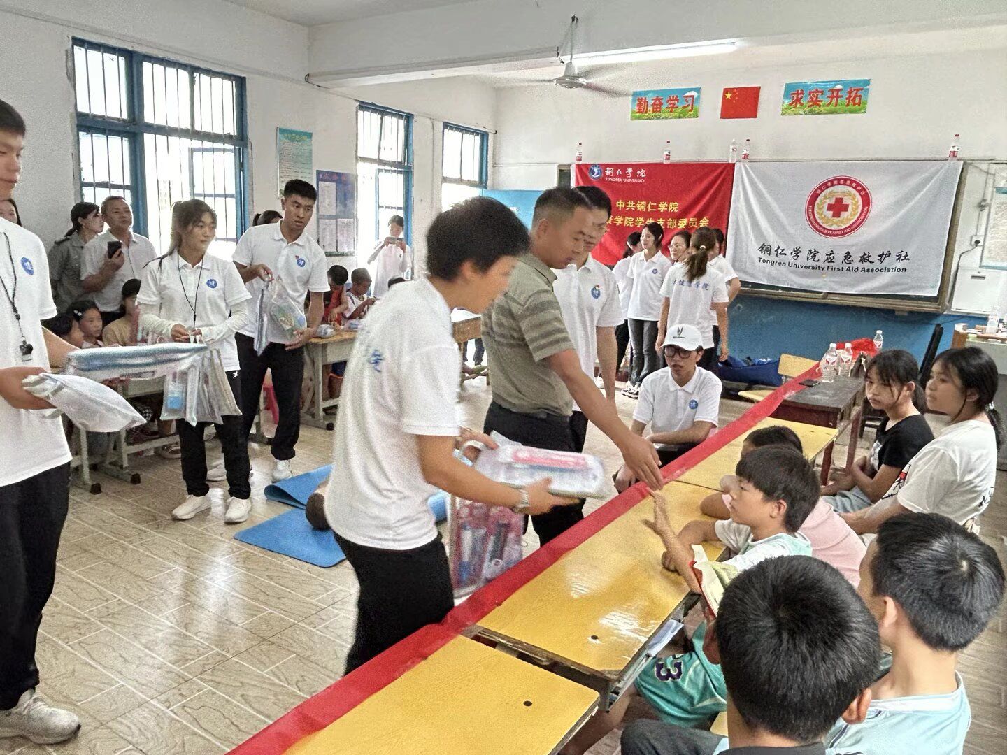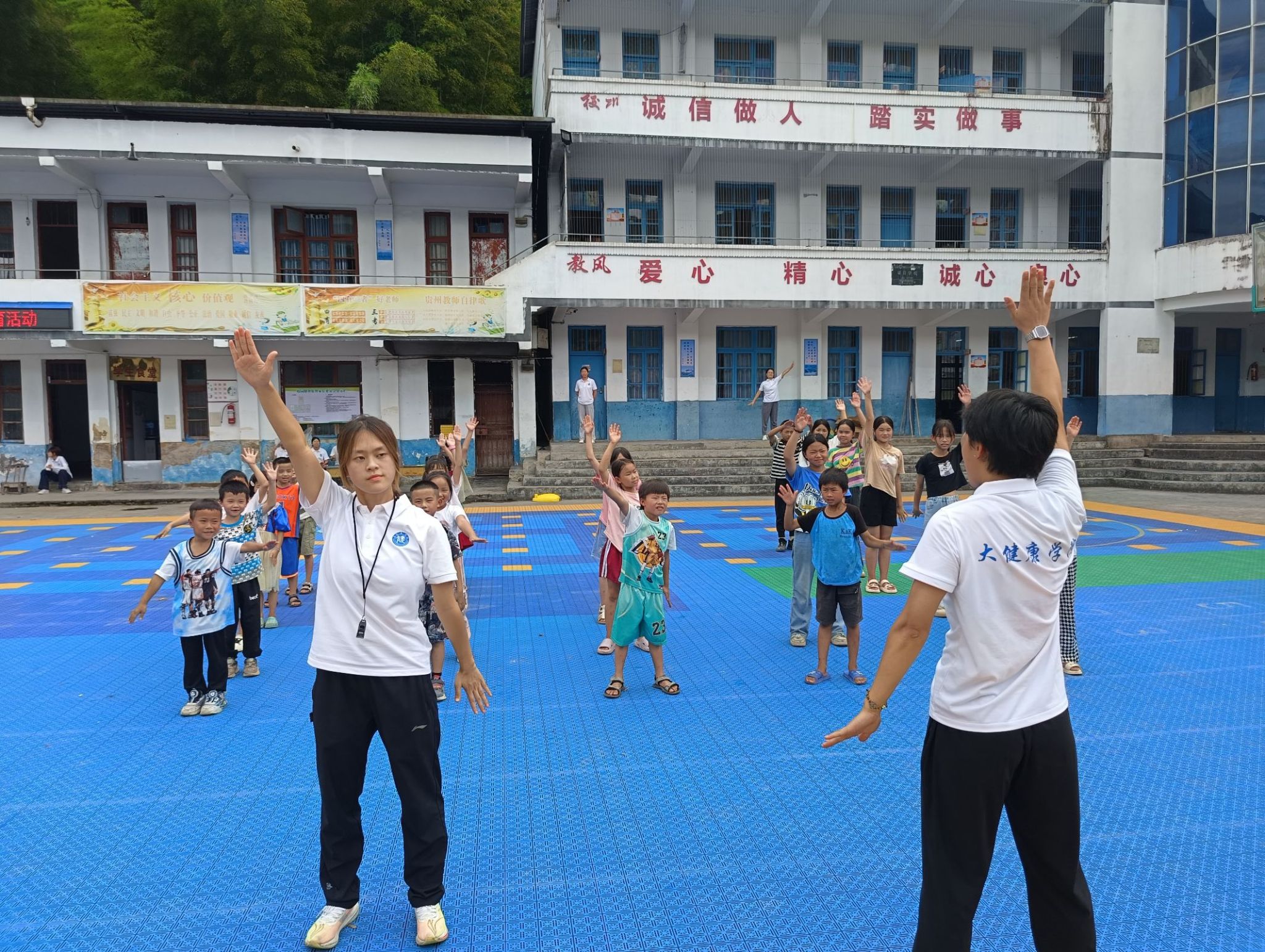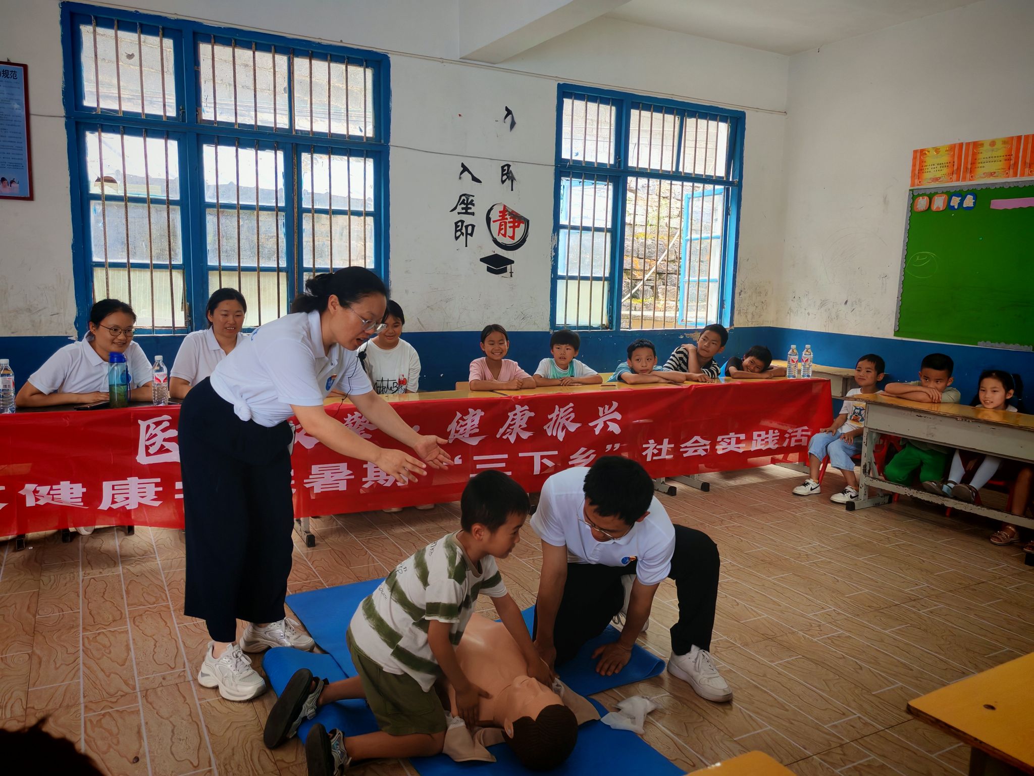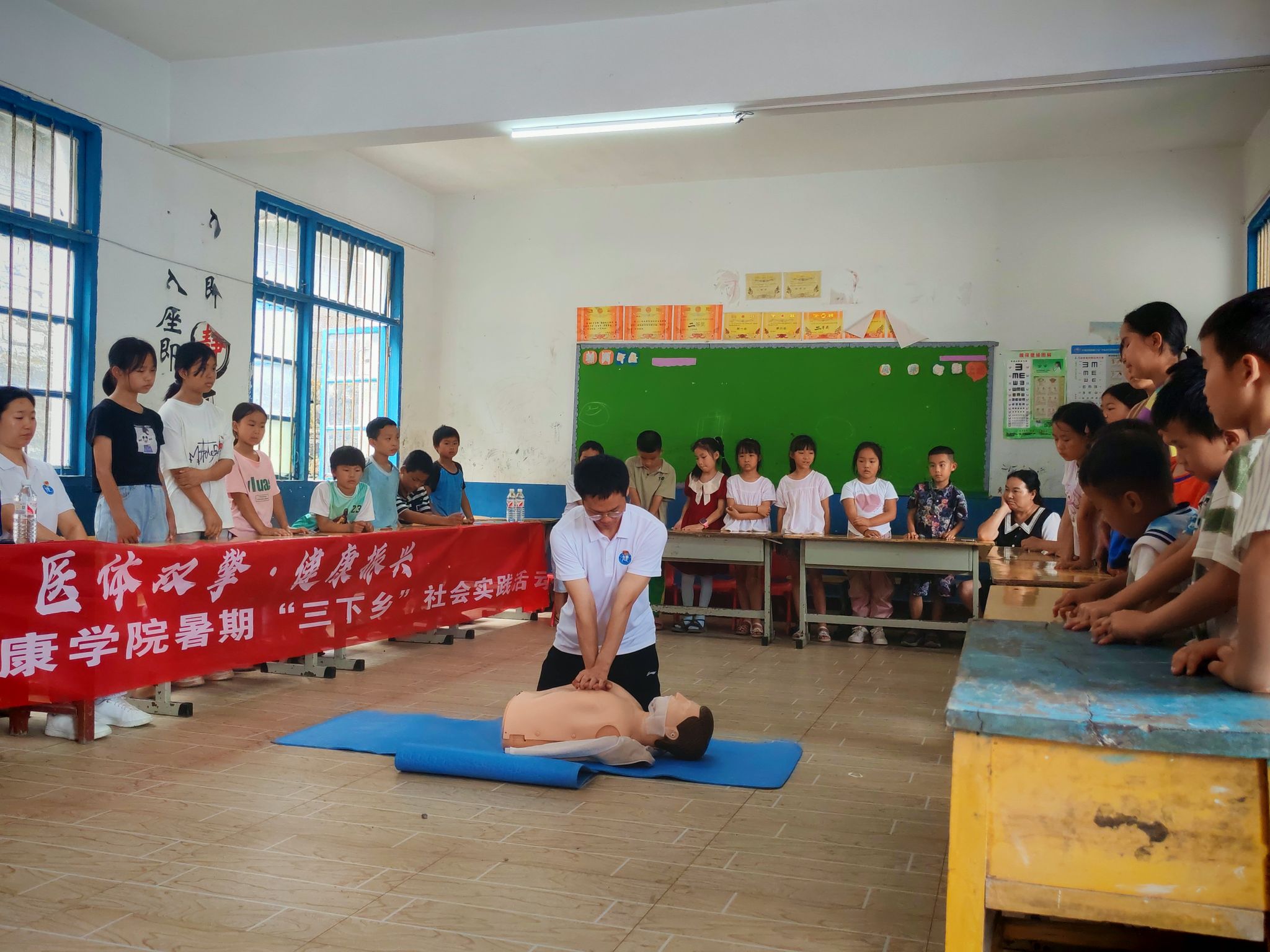 活动首日,“医体双擎·健康振兴”团队的成员们,先在木寨村小学讲解了相关急救的重要性,然后正确规范的演示了双人心肺复苏、单人心肺复苏、双人海姆立克、单人海姆立克等操作,随后,团队继续在现场为学生们分发基本运动器材,带领学生做体育趣味游戏,开展 “快乐分享会”,邀请学生主动分享参与活动的感受、最喜欢的游戏环节或在活动中收获的友谊;支教老师总结活动亮点,表扬积极参与、团结协作的学生并发放小奖品。