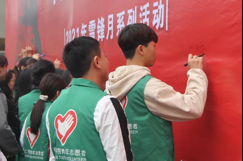 青年志愿者服务大队负责人吴玉怡带领同学们进行宣誓,“弘扬雷锋精神,传承红色基因,学识报效祖国……”从同学们的宣誓中,透露出大家为担当复兴大任、争做时代新人、传承红色基因的坚定态度。最后,在大家齐唱《学习雷锋好榜样》的歌声中,结束了此次活动。