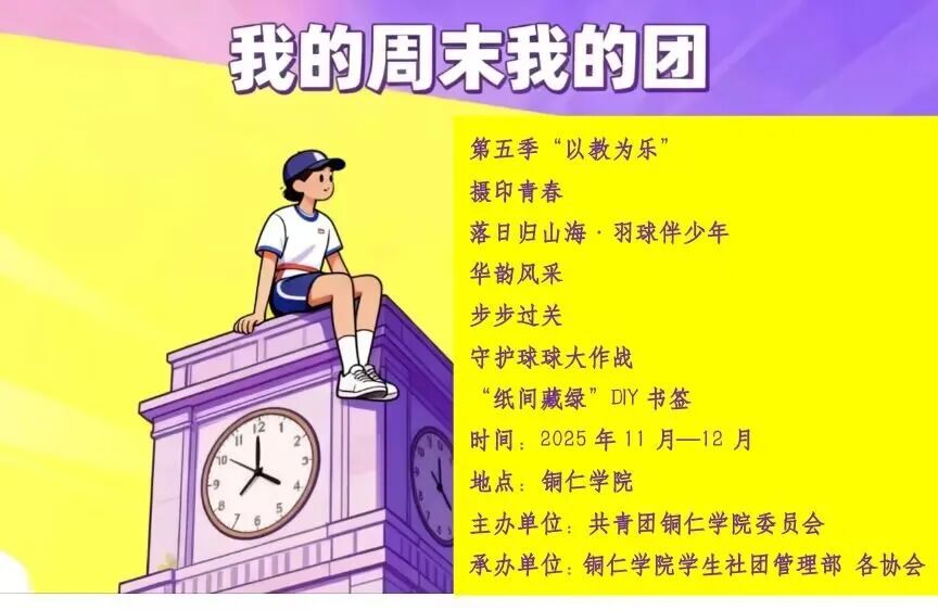 “我的周末我的团”系列活动期待你的参与!它既能为校园文化活动注入蓬勃生机,让校园氛围愈发温馨融洽,也能助力铜院学子锤炼综合素养、实现全面发展。目前,一场场精心筹备的精彩活动已就绪,诚邀每一位同学积极报名参与,和我们一起踏上这段趣味十足、充满无限可能的旅程,收获实打实的快乐与成长!有你的加入,这些活动必将绽放更耀眼的光彩。