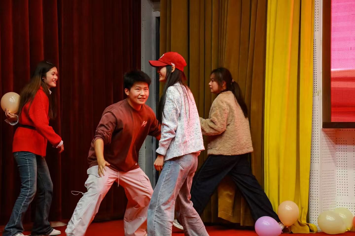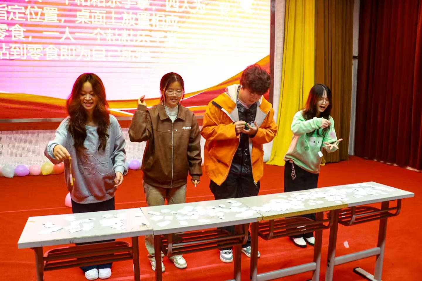 互动环节中,“手掌粘粘乐”“动作猜词语”“蒙眼尖叫鸡”等趣味游戏轮番上阵,不仅增进了部门间的协作与交流,更引来阵阵欢声笑语,现场气氛持续升温。在“趣味踩气球”团队竞技中,各部门依据前期游戏积分兑换道具展开激烈角逐,最终采编部凭借出色发挥赢得胜利。