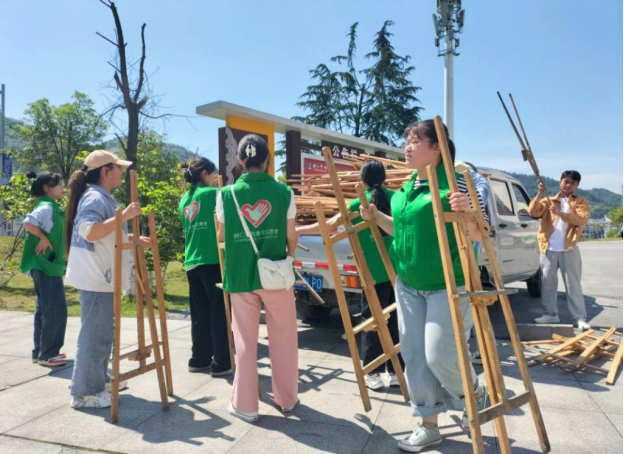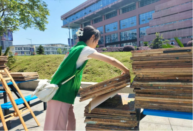 上午9:00,志愿者们如约抵达丹桂食堂一楼广场处集合,做好活动开展前期的准备工作,本次活动在同学们一片问好声中拉开了序幕。烈日炎炎,他们却热情不减,积极投身于志愿服务活动中,随后,志愿者们将本次五四手抄报展览、团知识竞答所需器具搬运至丹桂广场处。