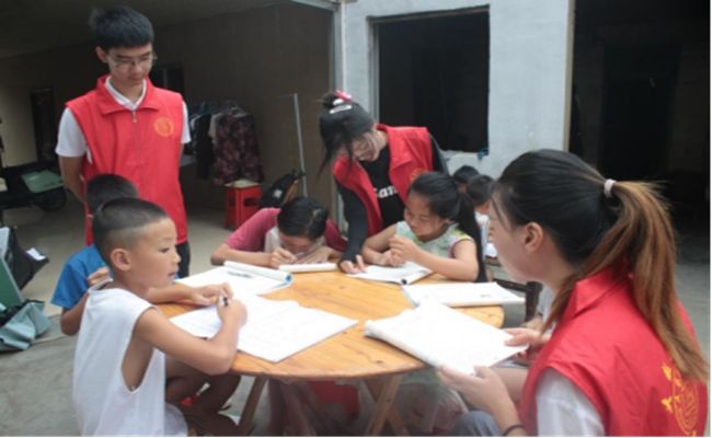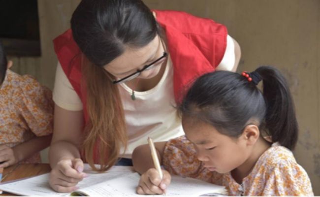 (志愿者为孩子们进行学业辅导)