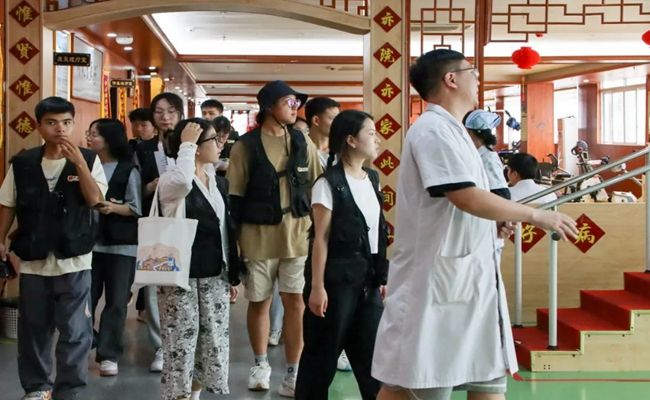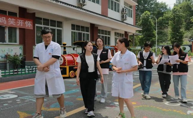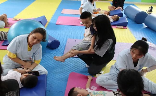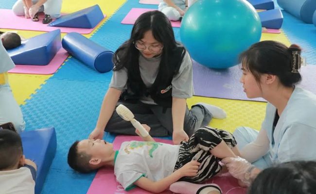 在医院康复治疗部副主任黄斌、罗婕护士长的带领下,实践队一行走访了医院各区域。铜仁康复医院主楼共有九层,二楼以中医为主,三楼是康复训练中心,四至六楼是儿童住院部,七至八楼以内科为主,医院开设有儿童培训教室、经颅磁刺激治疗室、言语认知训练区、特殊教育治疗室、感统治疗室、儿童运动治疗区、作业治疗区、中医治疗区、康复大厅、户外实景教学区等。
