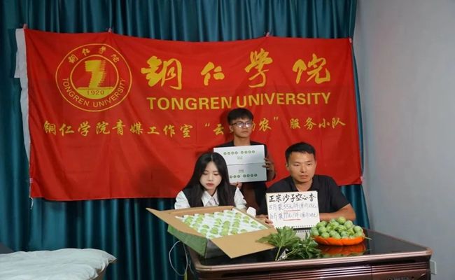 “贵州特产沿河沙子空心李,果肉脆嫩,清香浓甜,具有清热解毒,健脾开胃之功效,心动的朋友们赶紧下单吧!”直播间里,来自校团委青媒工作室的周冬菊、舒大川同学正热情洋溢地为观众们介绍沿河空心李,主播、助播、运营、摄像等岗位的队员们各司其职,整个直播过程有条不紊。