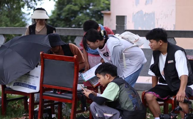 7月11日,实践队一行早早来到川硐敬老院,与老人话家常,为老人揉肩按摩,关注他们的身体健康。在了解敬老院老人的基本情况后,实践队成员开始架相机、摆相框、开电脑,为拍照做准备。拍摄过程中,实践队成员边沟通边引导,“爷爷,看镜头,一、二、三,茄子!”“奶奶,放轻松,笑一笑!”在进行拍摄的同时,实践队成员也耐心为老人们讲解反诈、禁毒常识,利用发生在身边的真实案例,以通俗易懂的方式普及常见的网络诈骗的形式、毒品的危害以及防范措施。